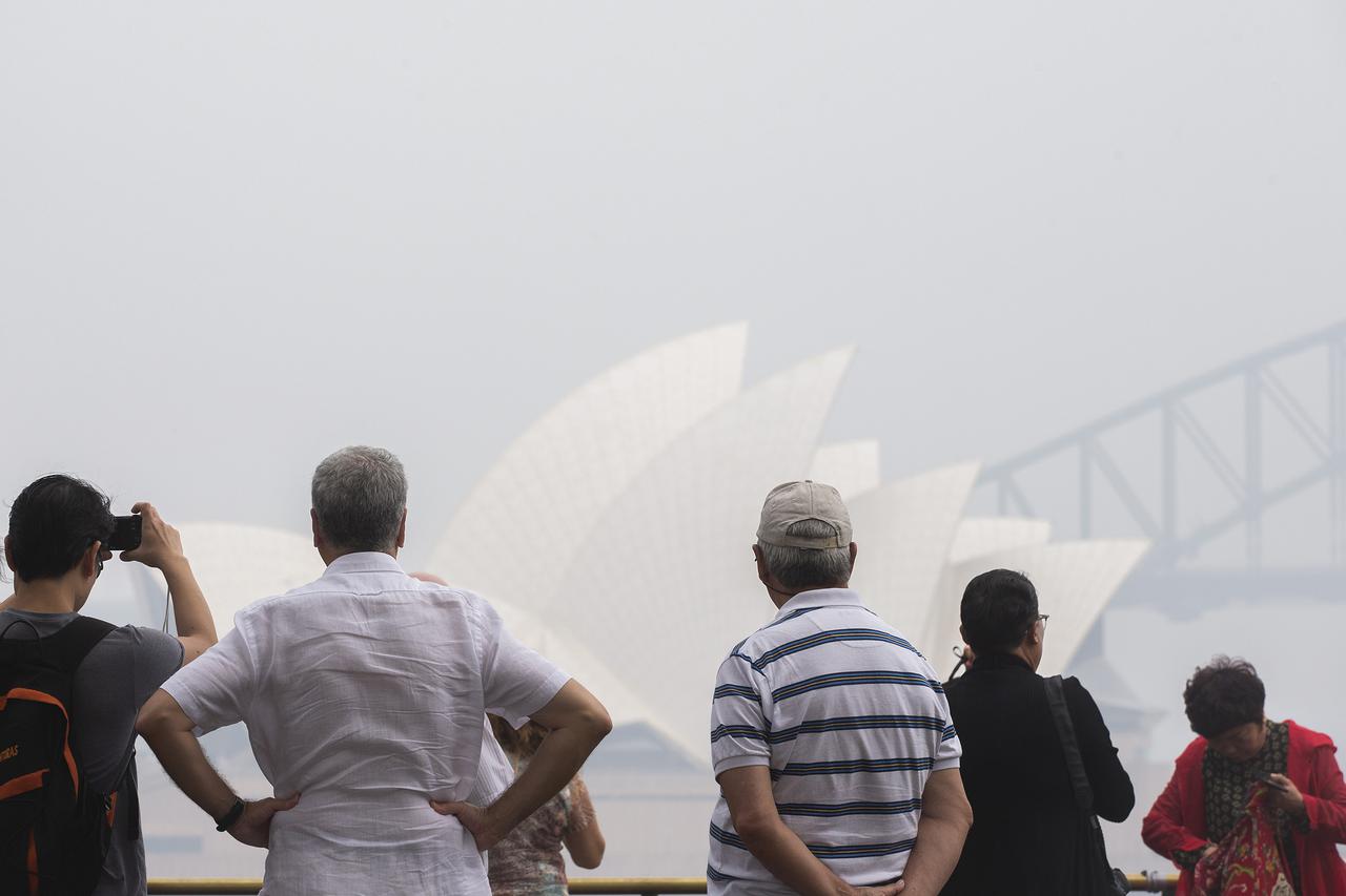 山火事の影響でオーストラリア各地の空は煙で覆われ、有害性が心配されている(シドニーのオペラ座前にて2020年1月8日に撮影)