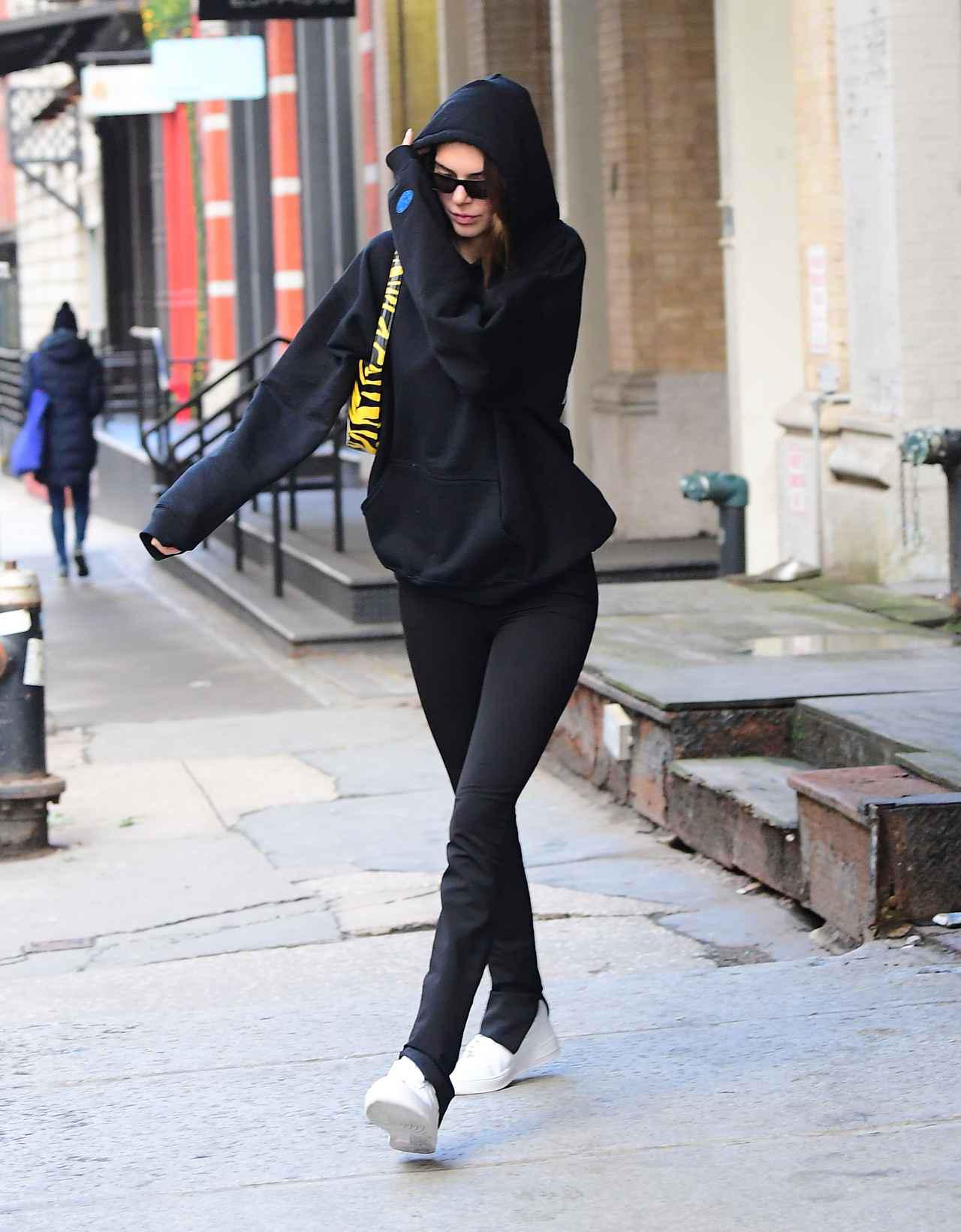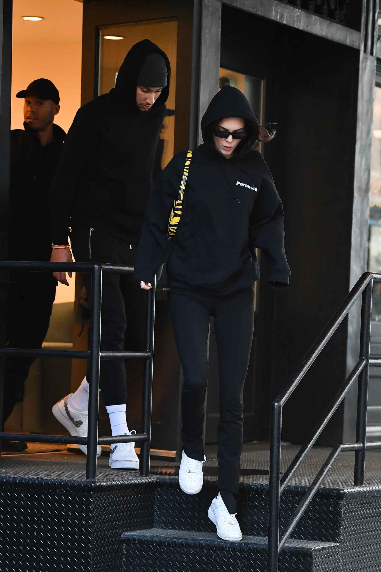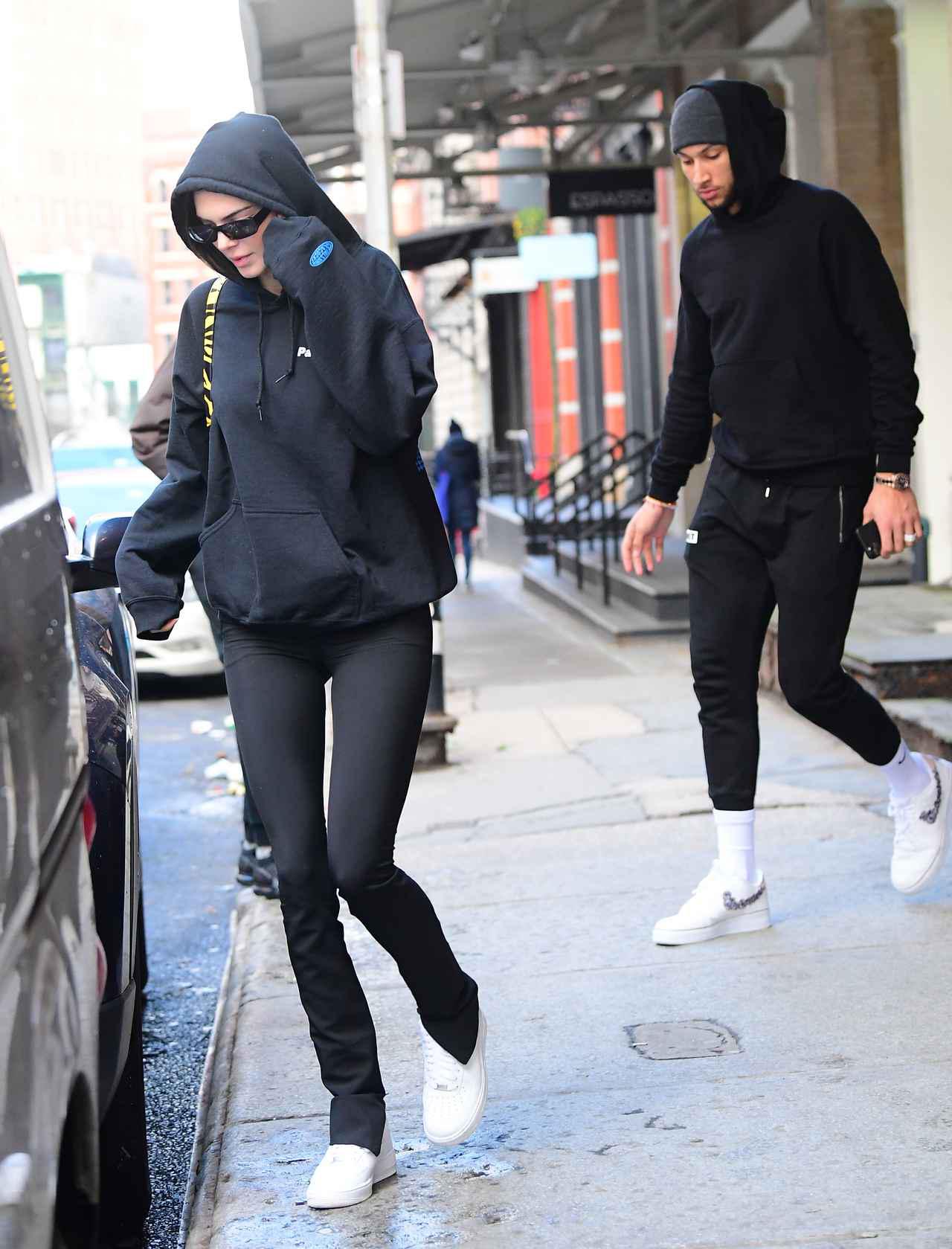 黒のフーディにヨガパンツ、白のスニーカーを合わせた全身ブラックコーデのケンダルと同じく、ベンも黒のフーディとスウェットパンツを合わせ、白のスニーカーでスタイリング。