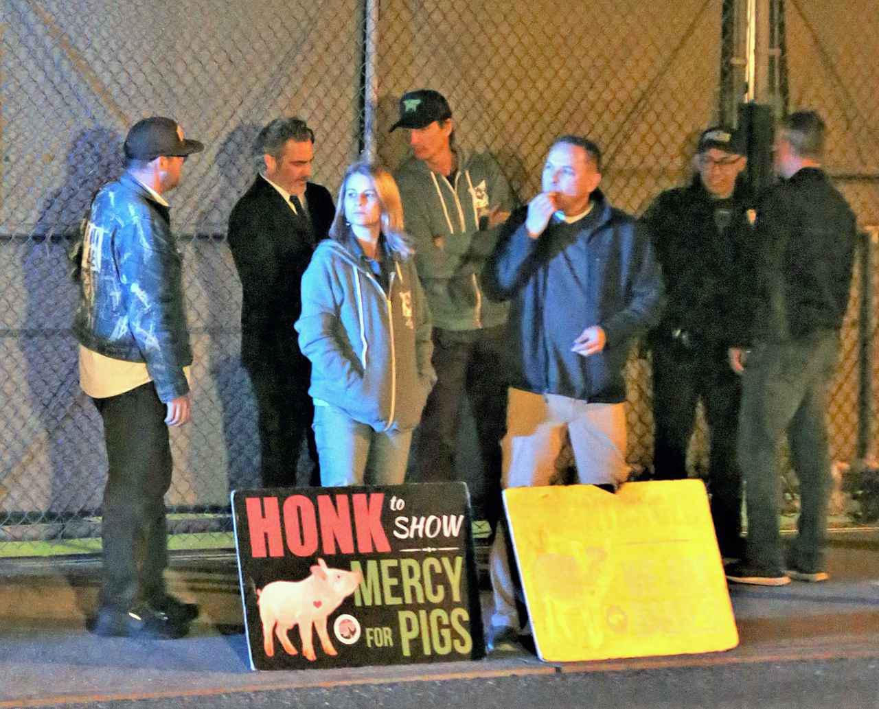 この日、食品処理場の前では畜産動物の劣悪な飼育環境や扱い方の改善を求める抗議活動が行なわれており、ホアキンも途中からグループに合流。抗議活動のほかに、「ピッグ・ヴィジル(Pig Vigil)」といって、 殺処分される直前の豚に水を与える慈善活動にも参加した。じつは、ホアキンは数ヵ月前にも同様の活動に参加していた。