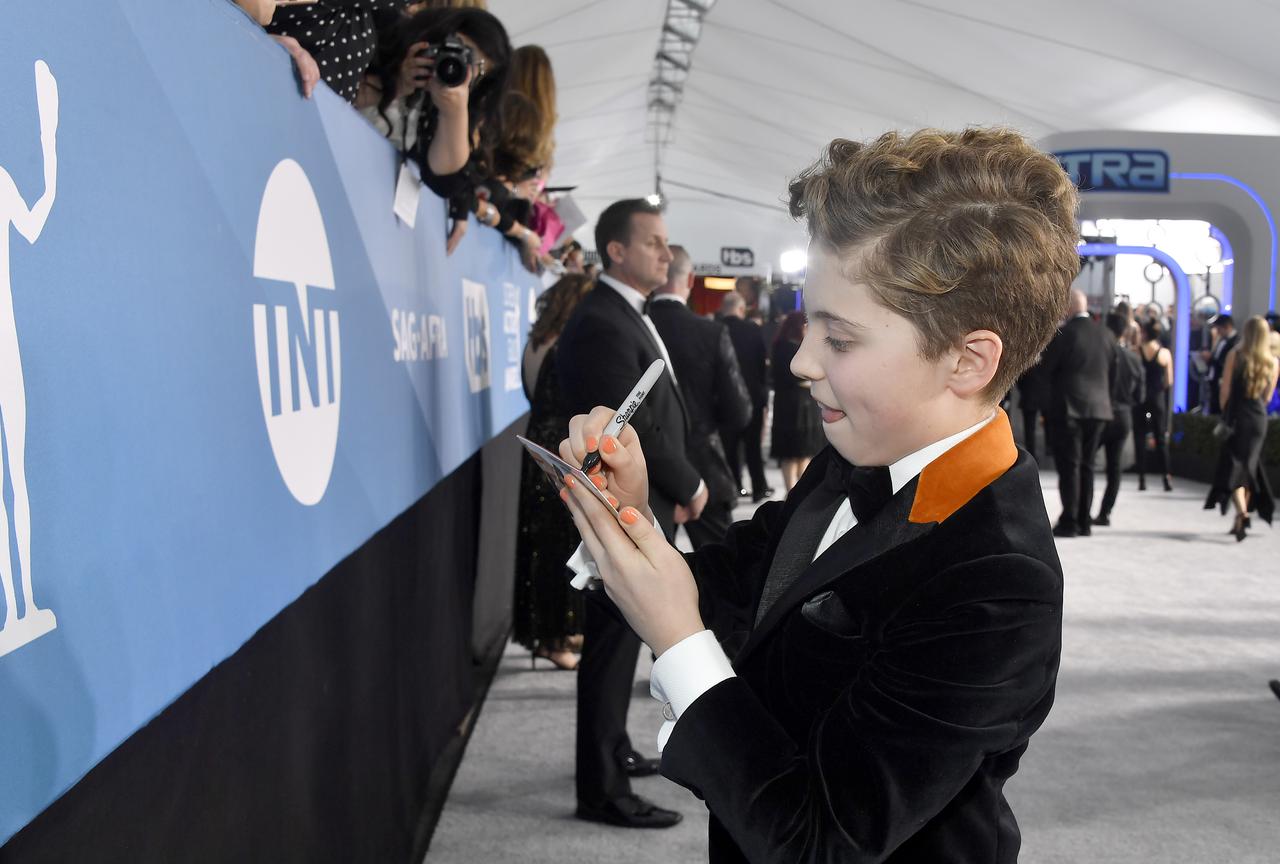 12歳の俳優ローマン・グリフィン・デイビスは、爪にオレンジ色のマニキュアを塗って登場。映画『ジョジョ・ラビット』のキャスト賞の1人にノミネートされていたローマンは、同じぐらいの年の男の子に写真をねだられ、嬉しそうにセルフィーをとった。
