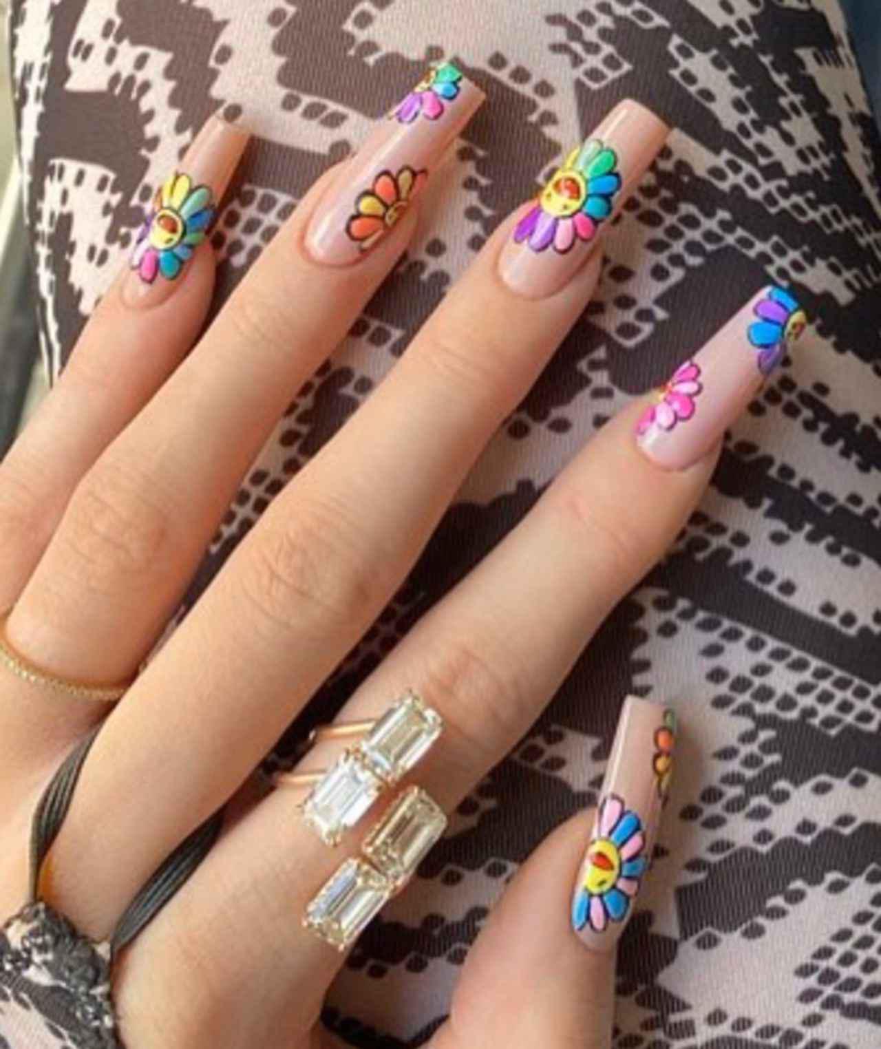 カイリーのネイルに描かれているのは、日本を代表するアーティストである村上隆が生み出した花のキャラクター。村上隆は、カイリーの異父姉であるキム・カーダシアンの夫のカニエ・ウェストと親交が深く、カニエの新曲のリスニングパーティーなどにも招待されたり、日本にカニエが訪れるとよく一緒にいるところが目撃されたりするほどの仲。