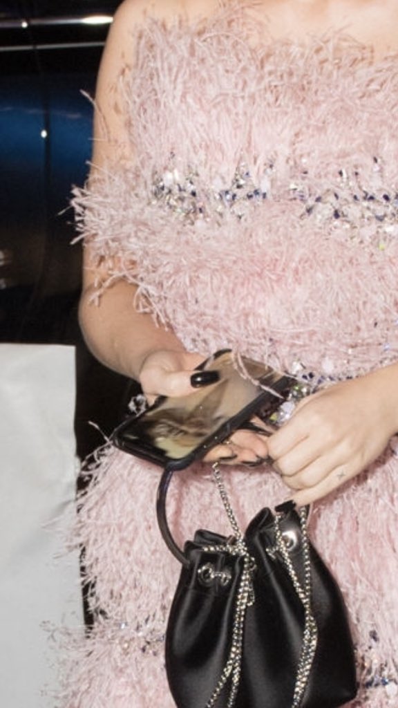 この日、ピンクのラブリーなドレスに身を包んだダヴ。キュートなファッションを披露したダヴの手元には、バッグとスマホが。