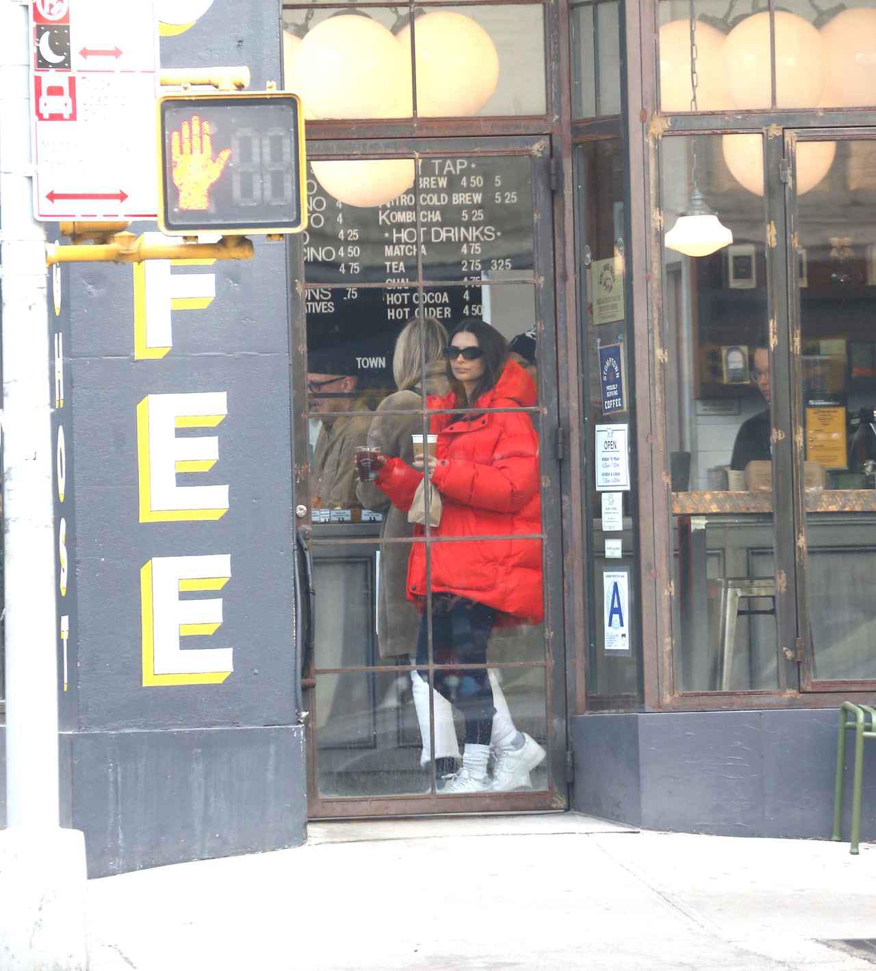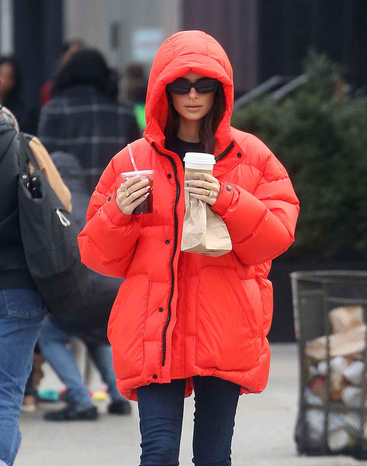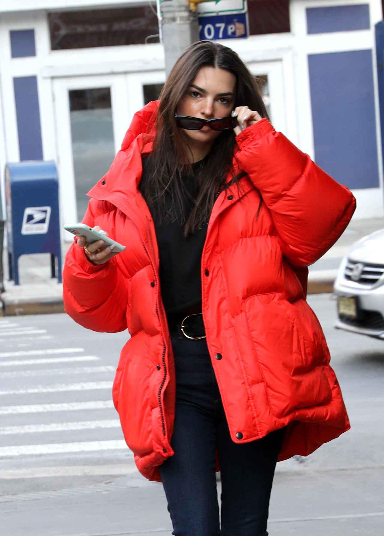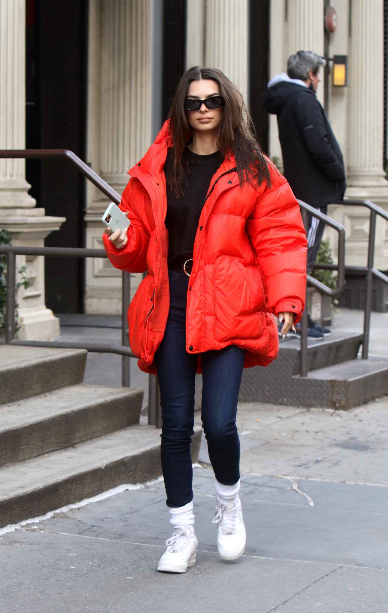 この日のエミリーは、鮮やかな赤いダウンジャケットとスニーカー、ジーンズをカジュアルにコーディネート。