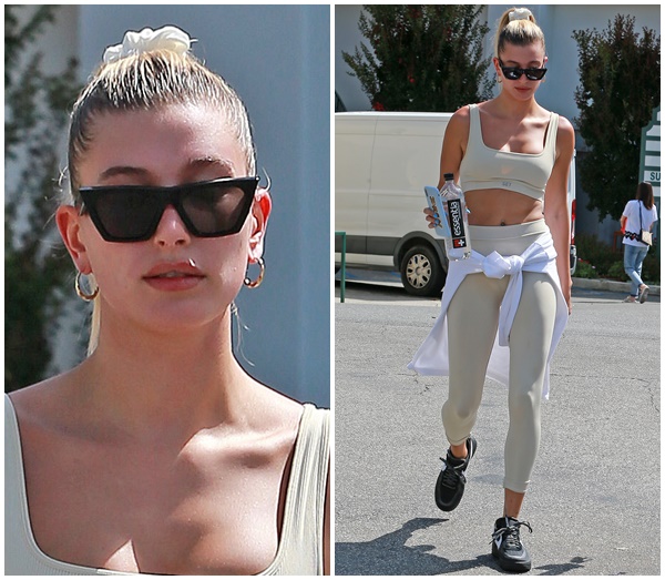 モデルのヘイリー・ビーバーは、高めのポニーテールにトレンドのシュシュをつけて90年代っぽくアレンジ。
