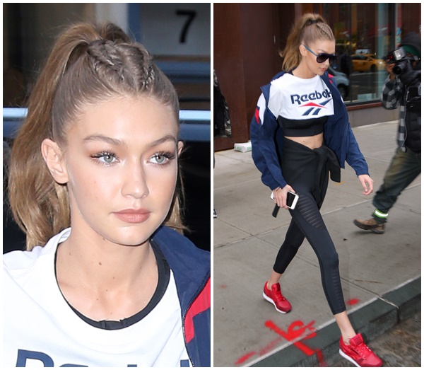 モデルのジジ・ハディッドは、高めの位置にセットしたポニーテールに編み込みを合わせたクールなアップヘアを披露。三つ編みを取り入れても◎。