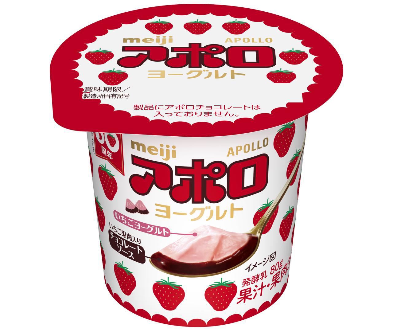 「アポロヨーグルト」は、濃厚なのに後味すっきりのいちごヨーグルト(上層)と、いちご果肉が入ったチョコレートソース(下層)を明治の独自技術を用いて2層仕立てにし、「アポロ」チョコレートの構造と味わいを表現。