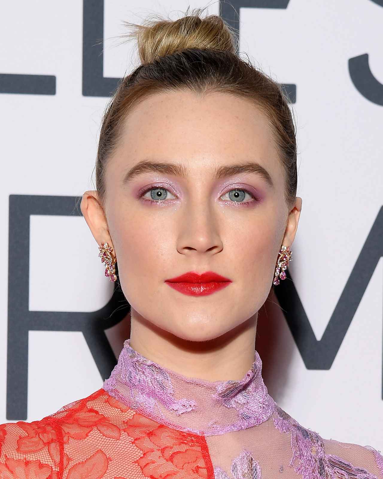 女優のシアーシャ・ローナンは、シアーな発色のピンクパープルでキラキラの目元に。鮮やかな赤リップが、さらにエレガントな雰囲気に仕上げている。