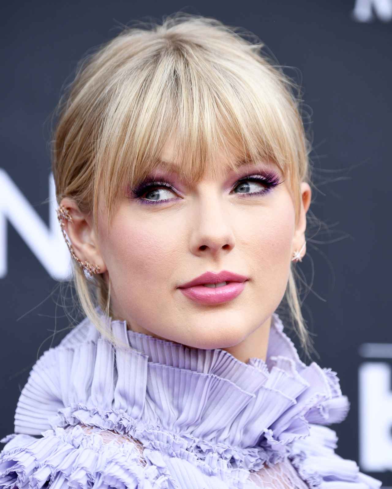 シンガーのテイラー・スウィフトは、凛とした青みパープルのアイシャドウに、同系色の青みピンクのリップを合わせて透明感あるメイクに。