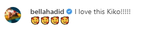 水原希子が中国を訪れて現地の人と交流する様子が映されているこのビデオに、ベラは「これ素敵ね、希子!!!!!」と、笑顔がハートに囲まれた絵文字と共にラブコールを送った。