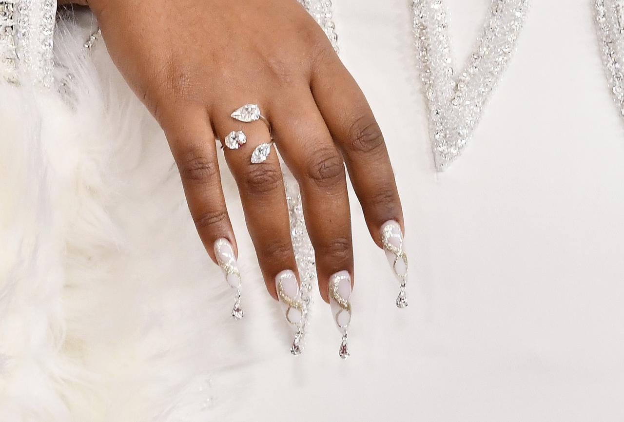 ドレス同様に白を基調としたネイルを選んだリゾ。8部門で最多ノミネートとなったリゾは、ミルキーホワイトのベースの上からゴールドで「8」という数字を各指にデザイン。さらに爪の先端には、ティアドロップ型のストーンを用いて遊び心満載のネイルに。