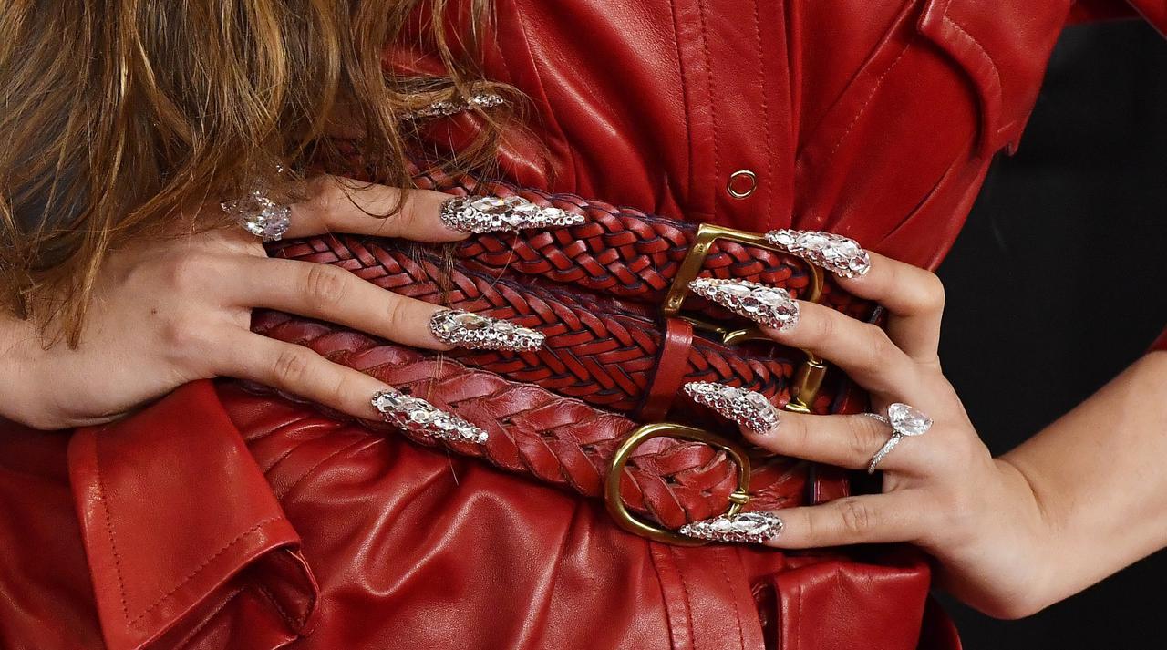 インパクト大な真っ赤なレザーの衣装でグラミー賞授賞式に参加したロザリアは、手元にも衣装に負けていないインパクトを。ロングネイルは大小さまざまな形のストーンを敷き詰めてゴージャスに仕上げて。