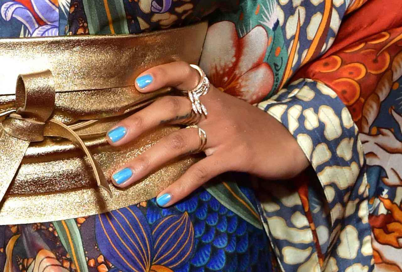 グラミー賞授賞式には、日本の伝統着である着物にインスパイアされた着物ドレスで参加したハー。この日は、ステージ上でギターを使ったパフォーマンスを行なうためショートネイルをチョイス。パフォーマンス中に着用した衣装がブルーだったため、その衣装とマッチさせたブルーのネイルで鮮やかに。
