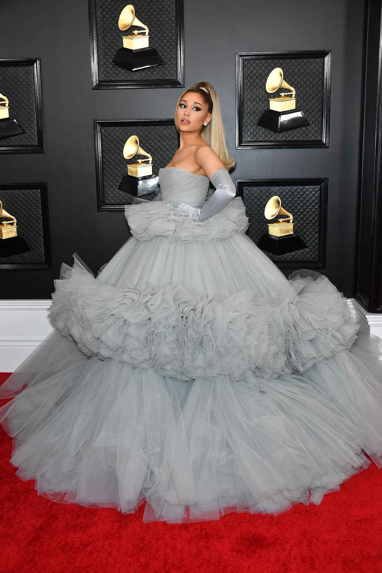 約4年ぶりとなるグラミー賞授賞式に、何層にも重なったチュールが美しいベアトップドレスを選び登場したアリアナは、GlamBOT専用カメラの前へ。