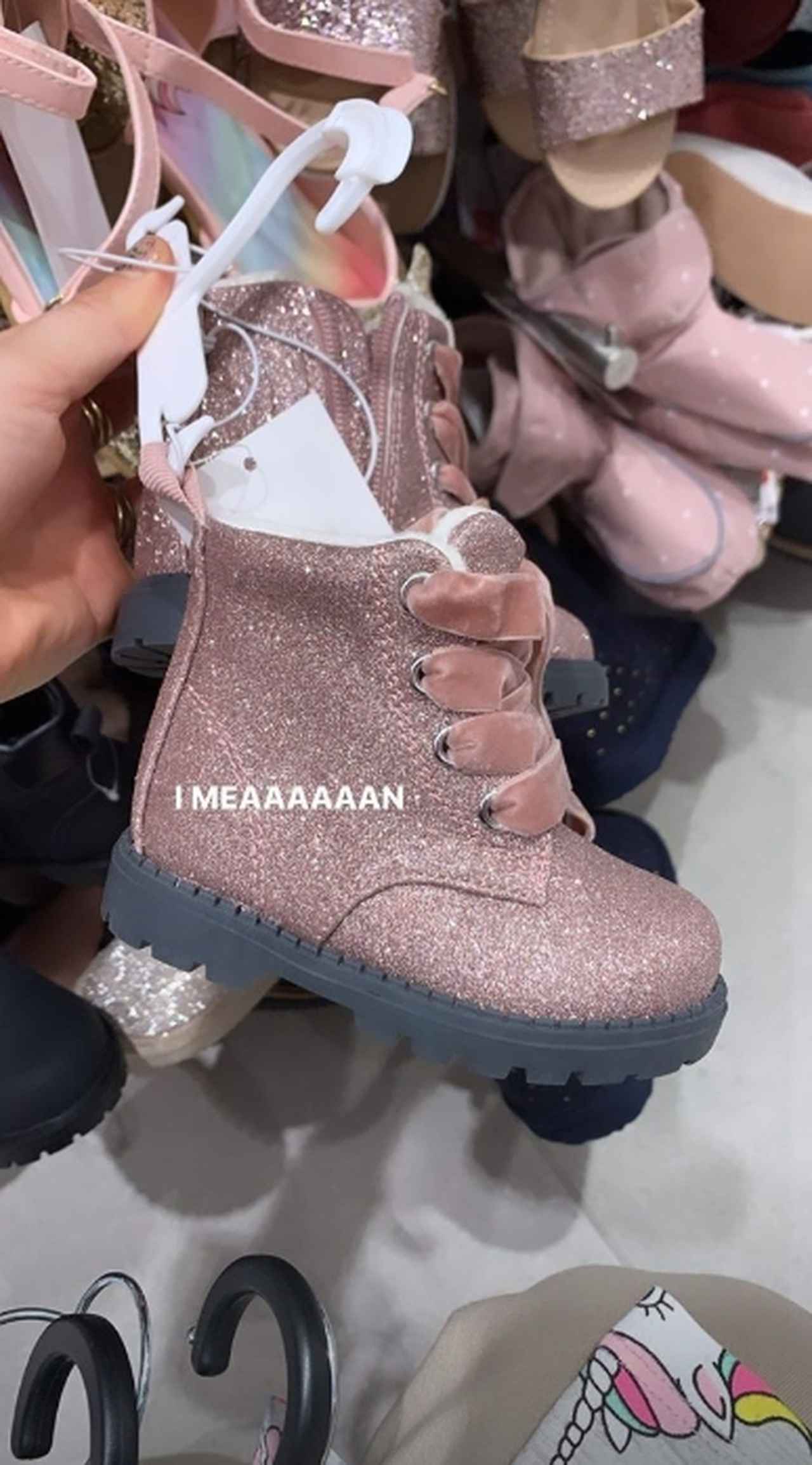 ベハティが投稿した写真に写るのは、人気ファッションブランドH&Mの店内。子供用のシューズを手にとり、可愛くて言葉にならないとでもいうように「I MEAAAAAAN(※)」とひと言。さらに、この写真の端にはたくさんのハンガーが。