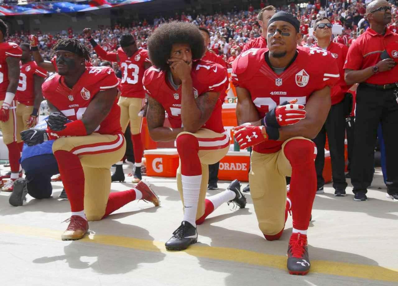 中央がコリン・キャパニック選手。保守派の人々が彼をCMに起用したナイキ(NIKE)のスニーカーを燃やすという一大騒動にも発展した。