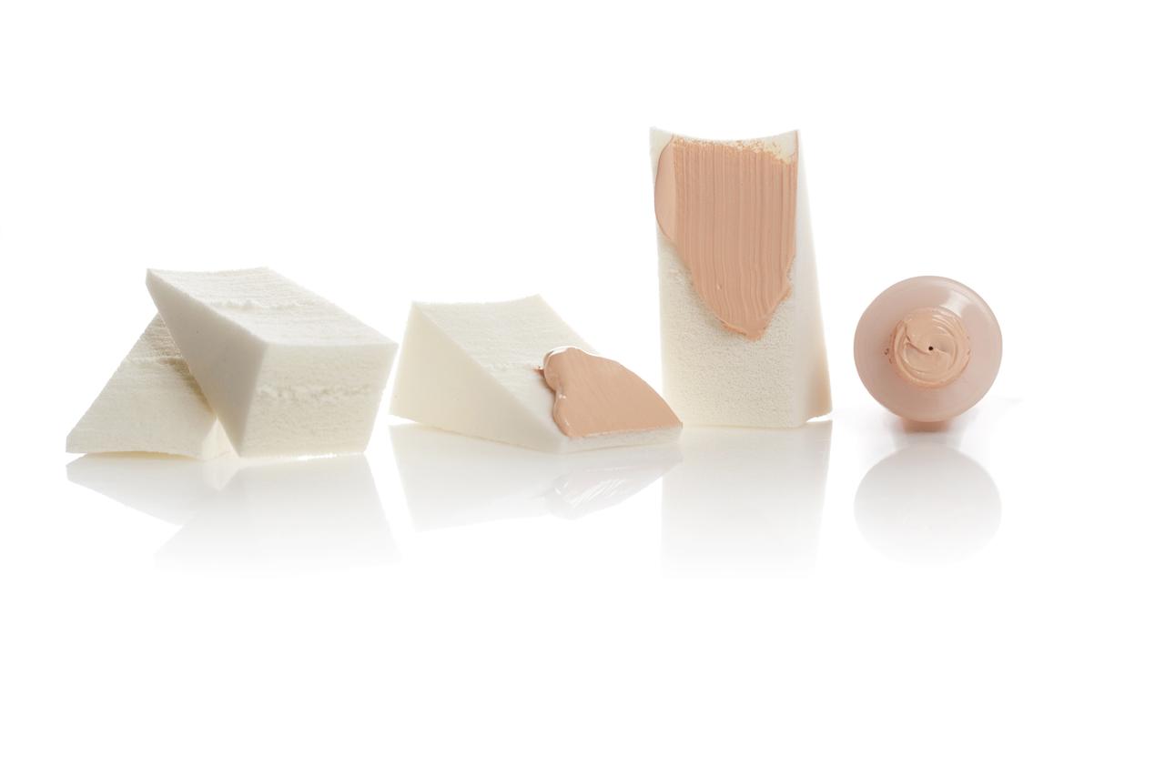 このネイルテクニックの要となるのが、三角メイクスポンジ。このスポンジの下準備でグラデネイルの仕上がりが決まると言っても過言ではない。はじめに、スポンジの面をテープなどを使ってほこりを取り除く。次に、スポンジの角をハサミで切り落とす。