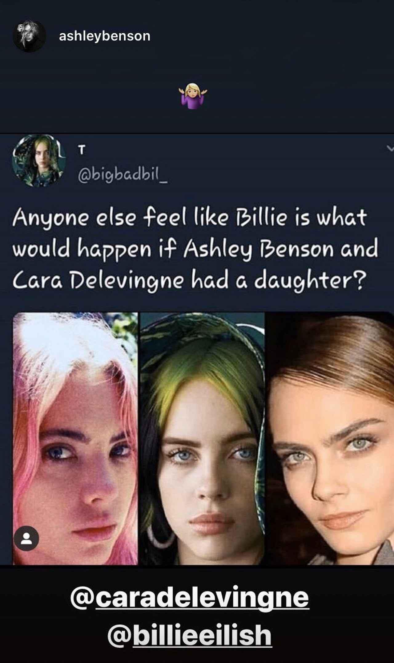 先日アシュレイが自身のインスタグラムを更新して、ある写真を公開。「もしアシュレイ・ベンソンとカーラ・デルヴィーニュに娘がいたら、ビリー(・アイリッシュ)みたいになると思う人はいない?」とコメントがつけられた画像には、左から、アシュレイ、シンガーのビリー・アイリッシュ、そしてカーラの顔が。