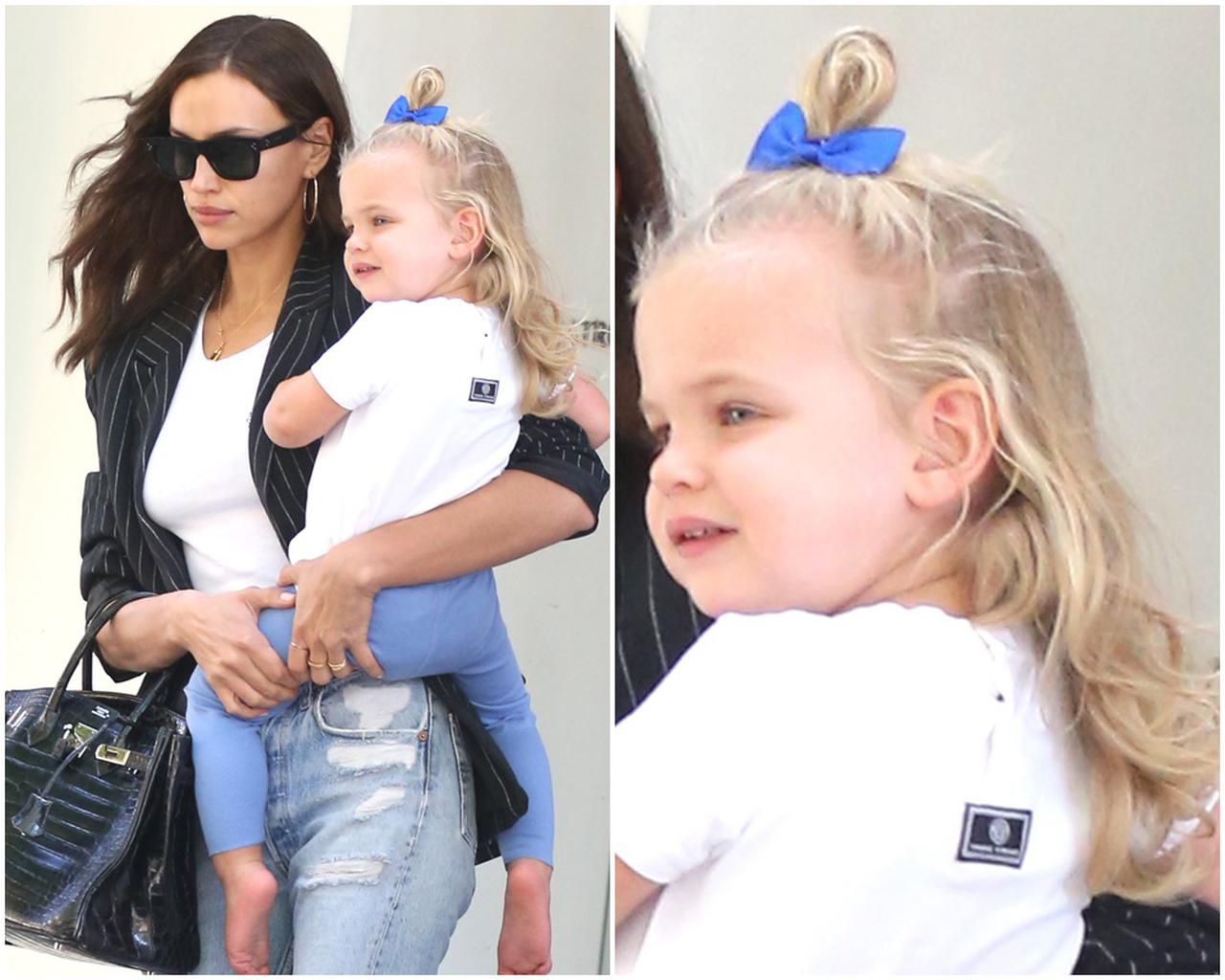 モデルのイリーナ・シェイクの娘リアちゃんは、頭のてっぺんに角のように作ったお団子がキュート。そこにボトムスとマッチしたブルーのリボンでキュートさを盛って。