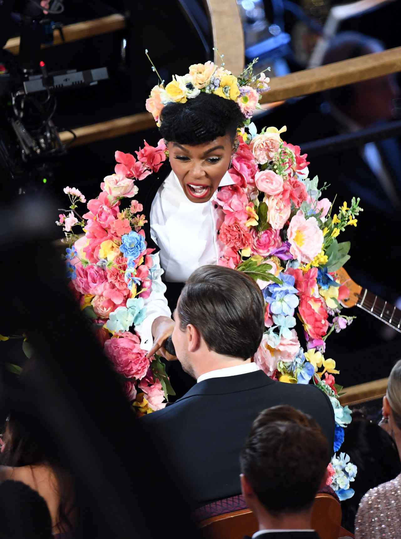 シンガー兼俳優のジャネール・モネイが、オープニングで披露したスペシャル・パフォーマンスの最中に「ララララランラン、ラランラン♪ さあ、私に続いて歌って!」と、会場の最前列に座っていたブラッドやレオナルドら出席者たちにマイクを向けて一緒に歌うことを要求。