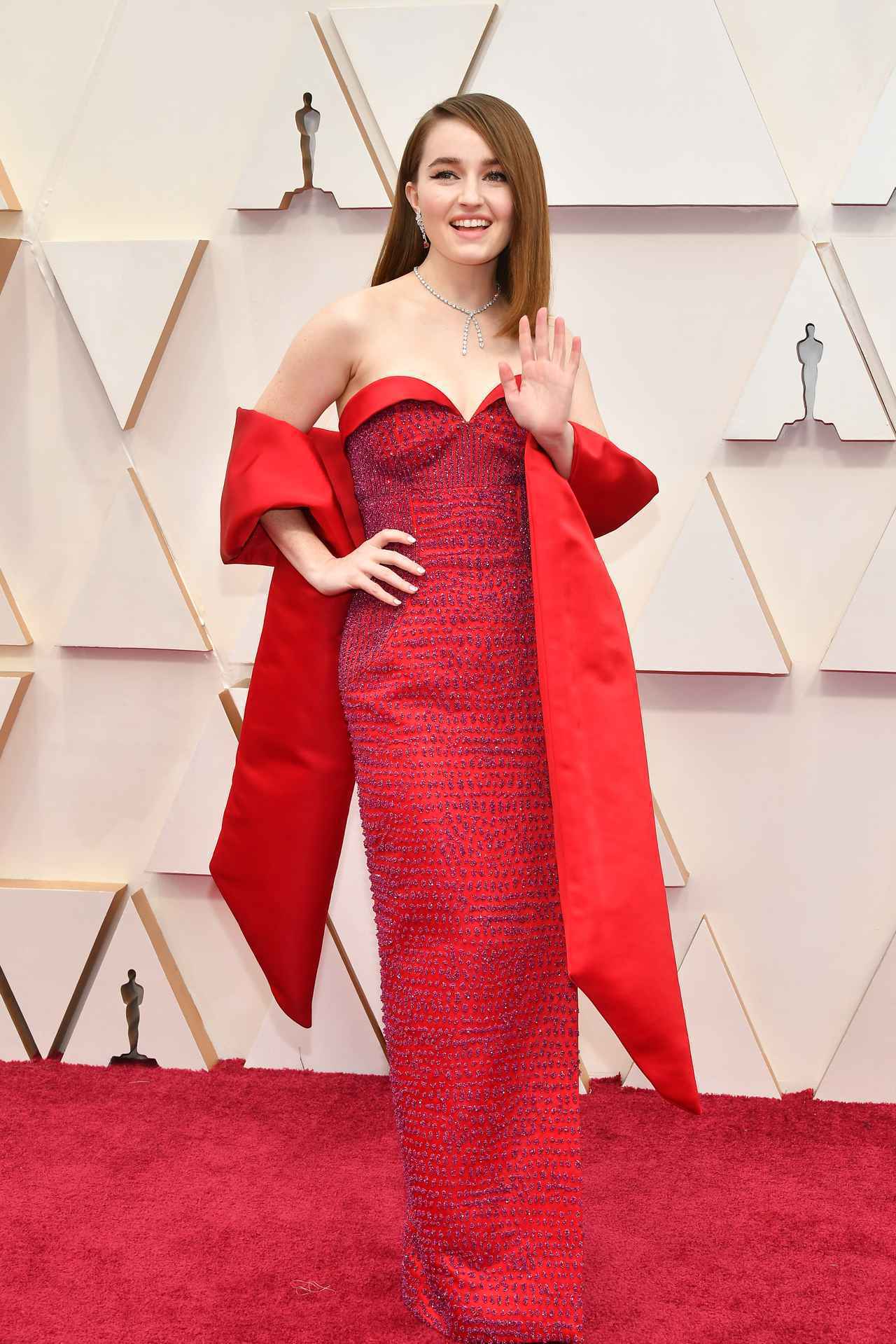 女優のケイトリン・ディーヴァーは、ハイブランドのルイ・ヴィトン(Louis Vuitton)が手掛けた”completely sustainable(完全なるサステナビリティ)” ドレスを着用。深紅のベアトップドレスに、スワロフスキークリスタルとガラスビーズで刺繍されたシルクサテンのドレスは、環境に配慮しリサイクルが可能なカスタムメイドのドレス。