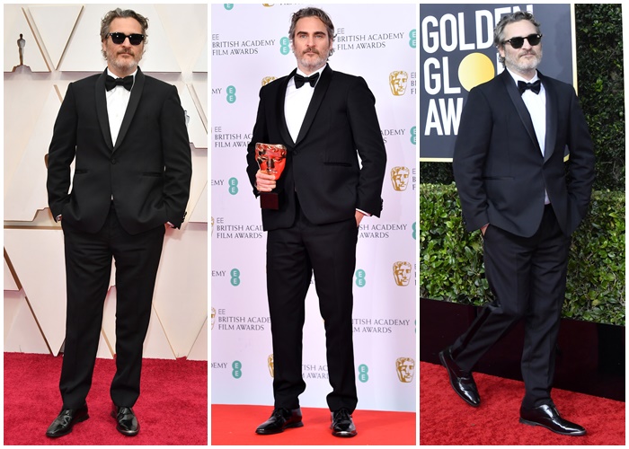 左から、2020年のアカデミー賞、英国アカデミー賞、ゴールデン・グローブ賞に、同じステラ・マッカートニーのスーツを着用するホアキン・フェニックス