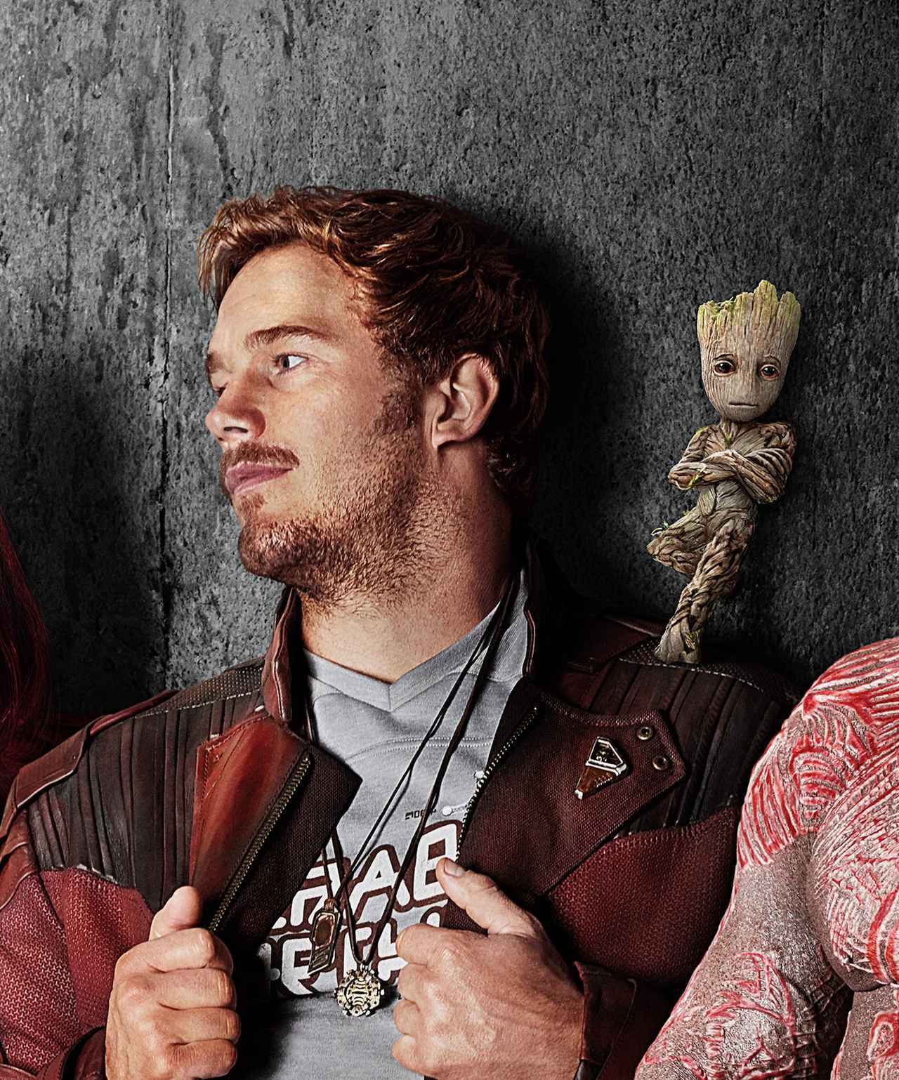 主演俳優のクリス・プラットの肩の上にのっているのがグルート。