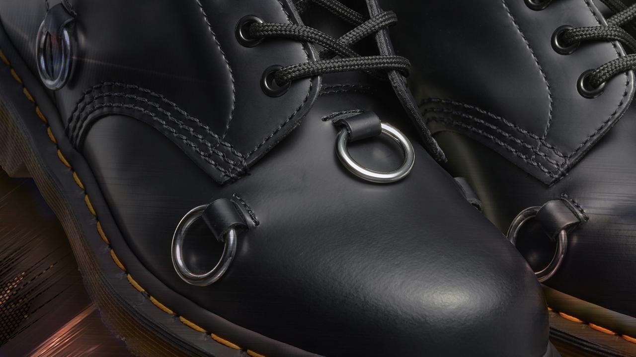 「1460」8 ホールブーツは、スムースレザーのアッパーにパンクスタイルを連想させるアナキスティックなニッケルリングの装飾を施し、70 年代後半のニューロマンティック/パンククラブシーンのカスタマイズスタイルを彷彿とさせる。リングの配置は、ラフシモンズのルーツであるミッドセンチュリーの家具へのオマージュとなっている。