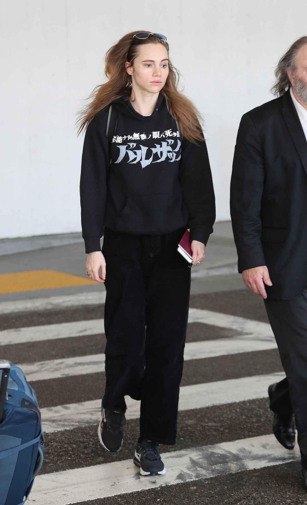 フライトを終えた直後で、リラックスした様子のスキは、全身黒コーデにカラーレンズのサングラスを合わせて移動。