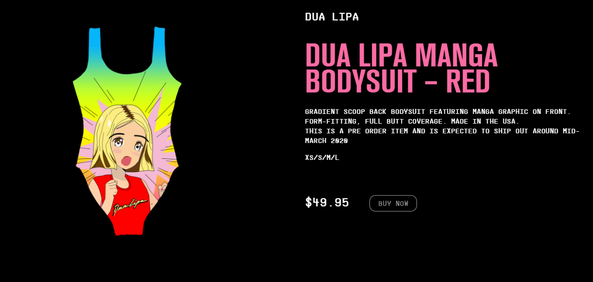 デュアが着用しているボディスーツには、胸元に「Dua Lipa」と描かれているタンクトップを着ているデュア本人の絵が。かなり目を引くデュアの絵は、日本の漫画のようなタッチで描かれていることから、デュア・リパ・マンガ・ボディスーツという名前がつけられオフィシャルサイト上で販売されている。