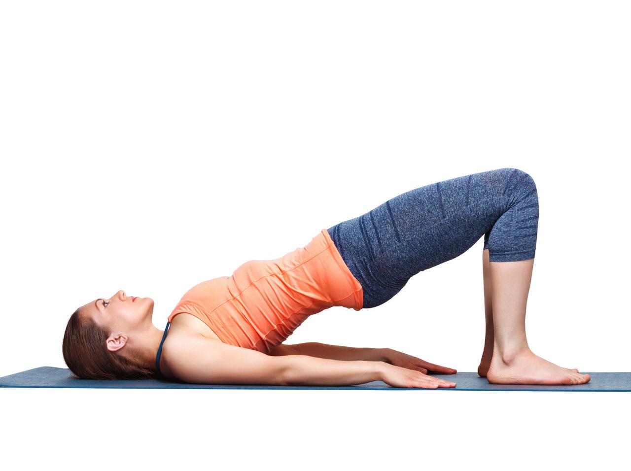 ステップ2:お尻を上にぐっと持ち上げて、肩からひざまでのラインが一直線になるところまで上げる。このとき、なるべくお尻の力だけで体を上げるようにするのがポイント。