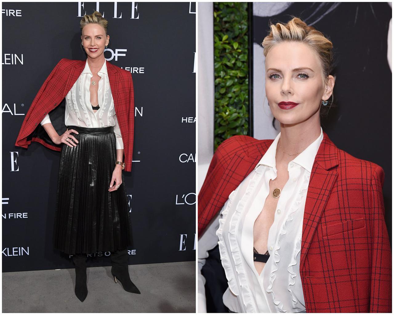 2018年、ロサンゼルスで開催されたELLE’s 25th AnnualWomen In Hollywoodでのシャーリーズはディオールのチェックのブレザーを羽織って、カッコよく決めた。映画『タリーと私の秘密の時間』では、出産後の女性を演じるため、3カ月かけて16Kg増量。24時間暴飲暴食をして肥満になったというけれど、それを感じさせないプロポーション。