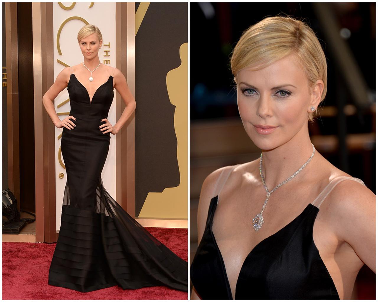 2013年とは対照的に、ロングのブラック・ドレスに、ハリー・ウィンストンの31カラットのネックレスを身に着けて2014年のアカデミー賞にやってきたシャーリーズ。最小限の装飾でも、とってもゴージャスに見える。