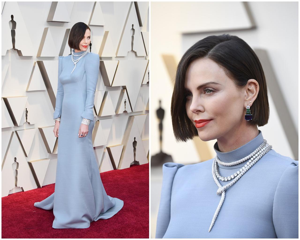 2019年のシャーリーズは、雰囲気を刷新。これまでのプラチナブロンドヘアーから、短いブルネットのワンレンにイメージチェンジして会場を驚かせた。水色のドレスは、ディオール、アクセサリーはブルガリ。