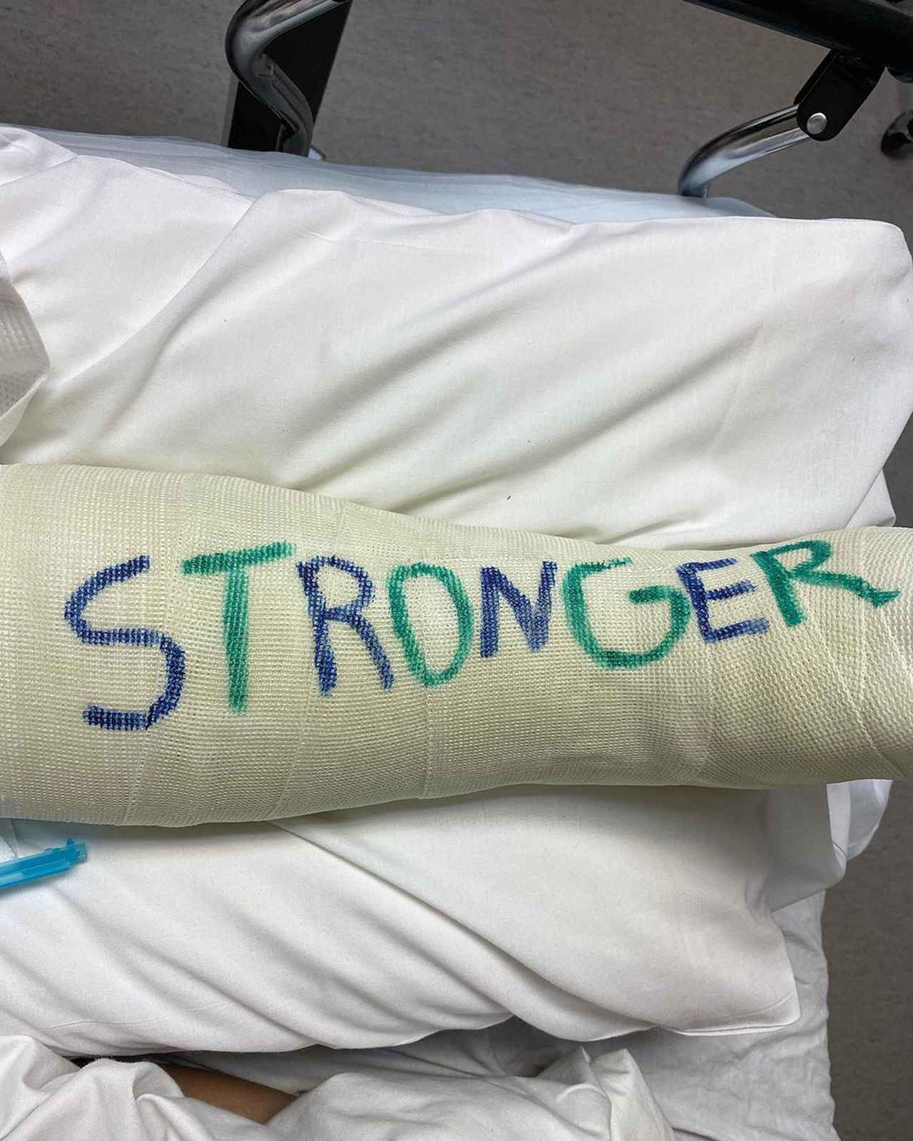 ブリトニーの左脚には、足の甲からひざ下までを覆うギプスが巻かれており、痛々しいのが一目瞭然。しかし、そのギプスにサムがブルーとグリーンのマジックでブリトニーが2000年にリリースした楽曲「ストロンガー」とかけて「STRONGER」というメッセージを残し恋人の復活を願った。