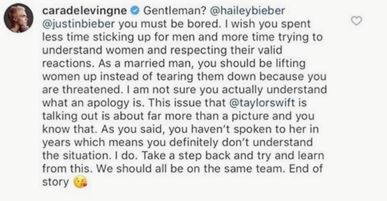 ジャスティンとヘイリーを痛烈批判したカーラのコメント。©Cara Delevingne/ Instagram