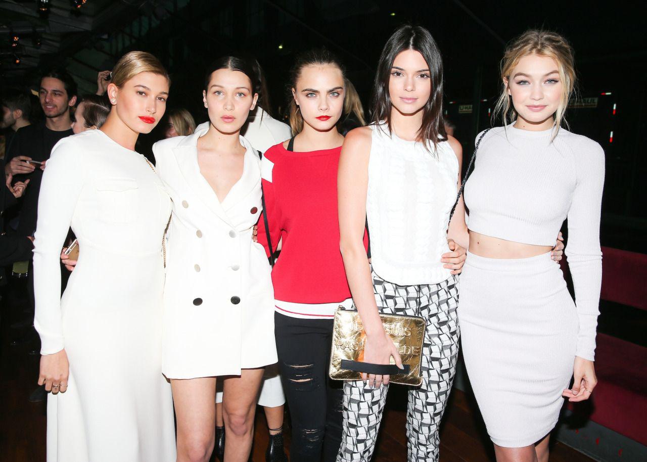 左から:ヘイリー・ビーバー、ベラ・ハディッド(ジジの妹)、カーラ・デルヴィーニュ、ケンダル・ジェンナー、ジジ・ハディッド。ヘイリーとケンダルは親友同士でケンダルは妹のカイリー・ジェンナーとともにジャスティンとヘイリーの結婚式にも参列した。