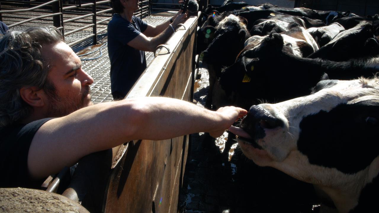 動物の権利を保護する活動を行なうホアキン・フェニックスが、食肉処理場から、母親の牛と子牛を保護した。(フロントロウ編集部)