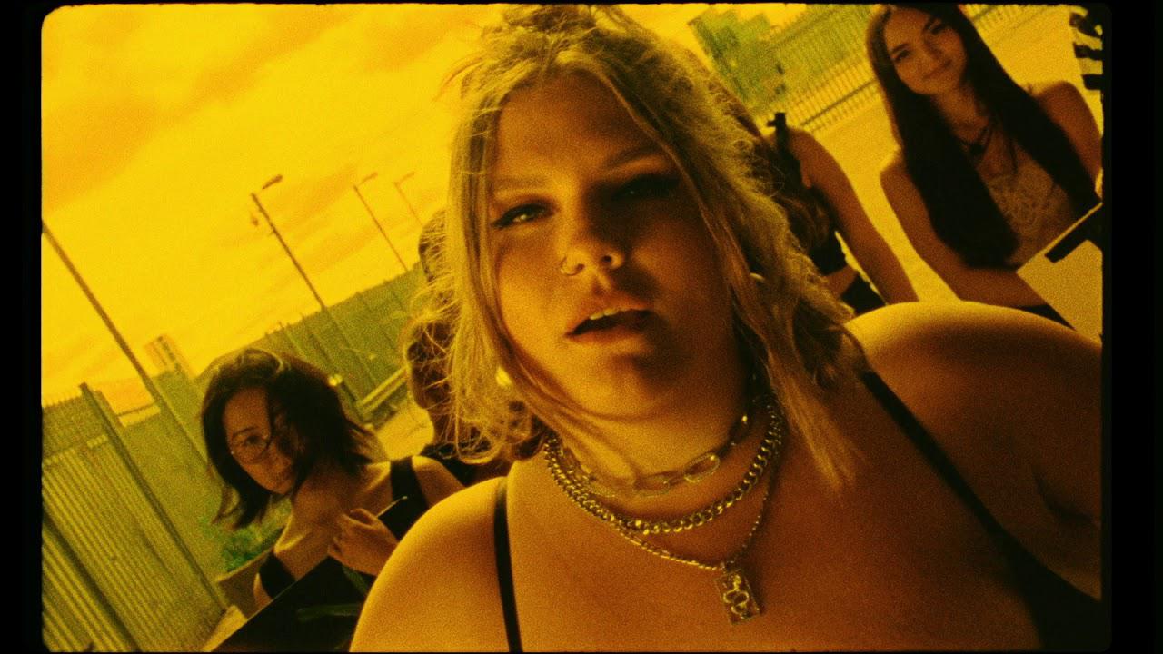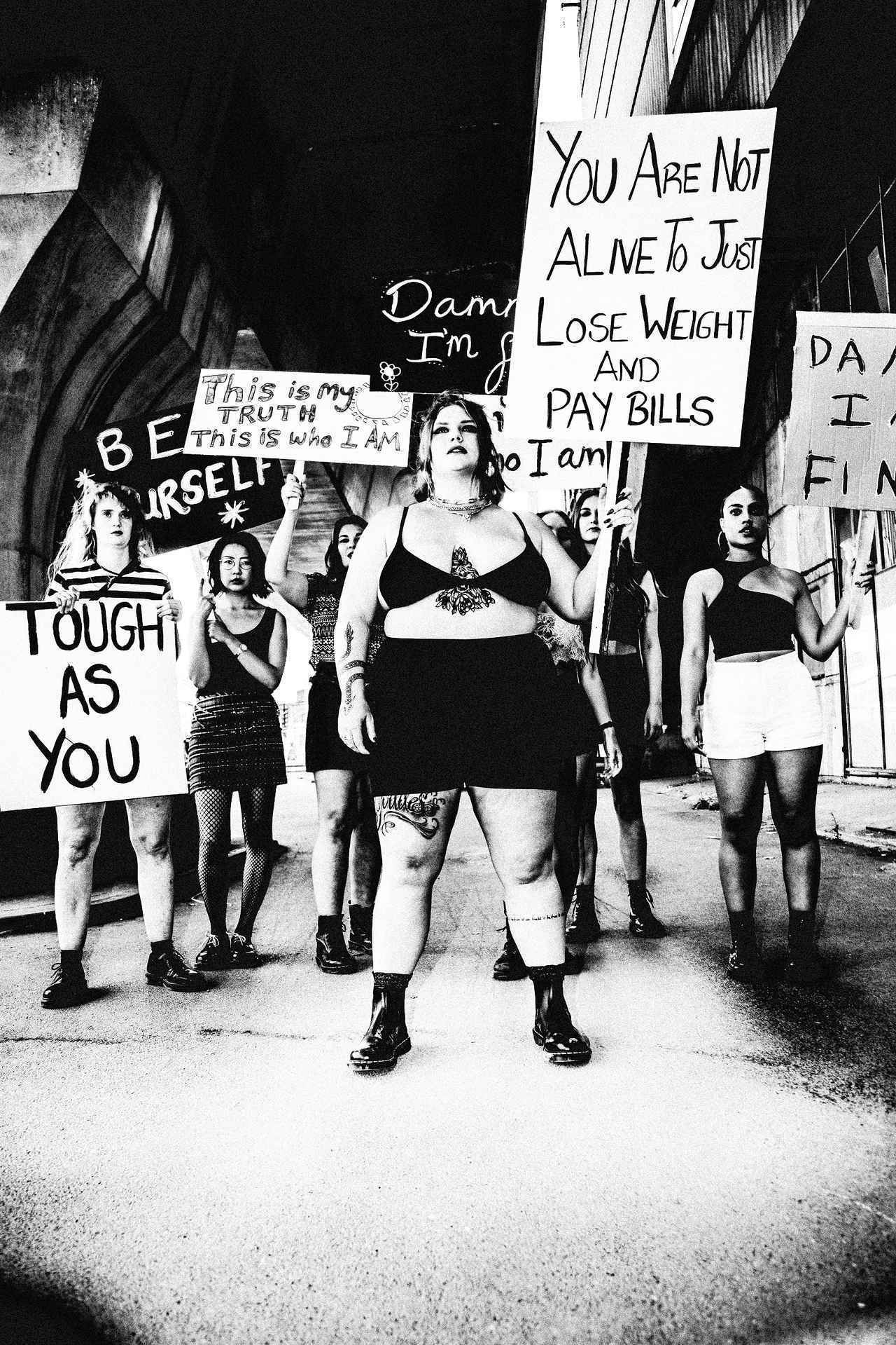 ドクターマーチンのブーツを履き、「あなたはただ体重を減らして、生活費を稼ぐために生きているわけじゃない」と書いたたプラカートを持ってメッセージを放つロッテ・ファン・エイク。