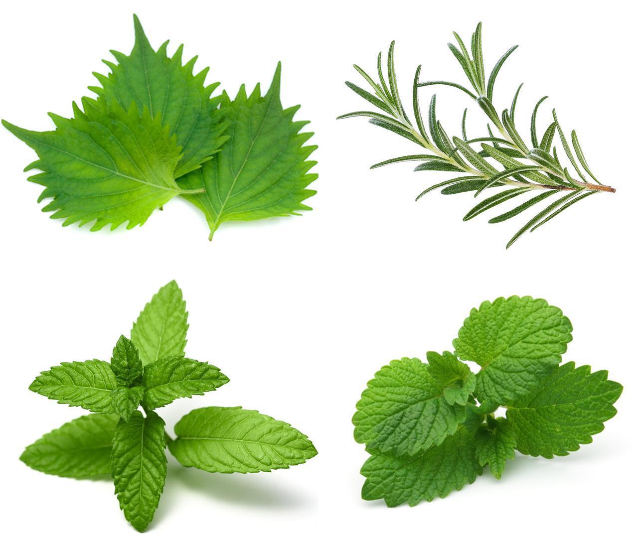 左上から時計まわり>シソ葉エキス、ローズマリー葉エキス、メリッサ葉エキス、セイヨウハッカ葉エキス