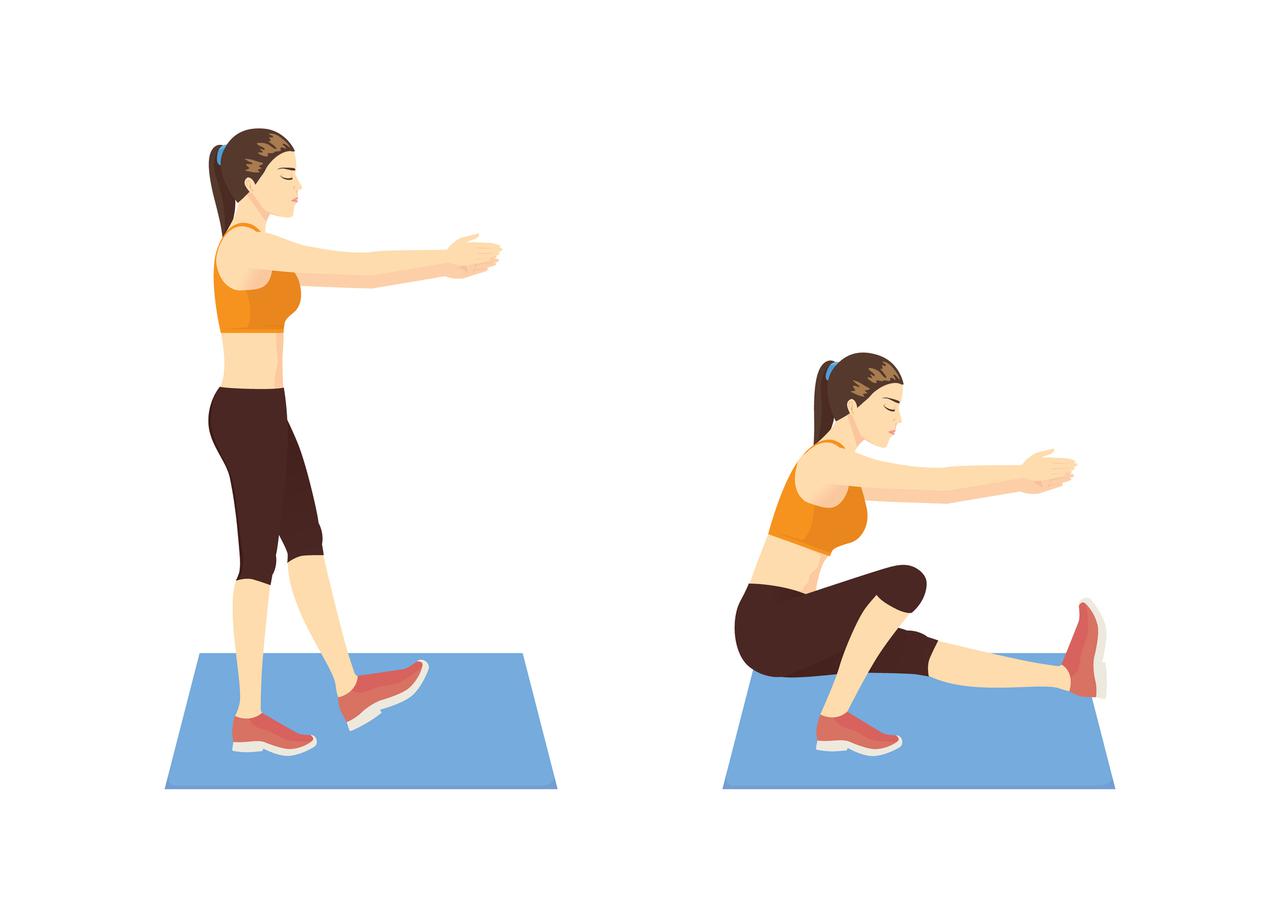 ステップ2:右足を前に伸ばしながら、左足を曲げて椅子に座る。このときに使うのは左足の筋肉のみ。