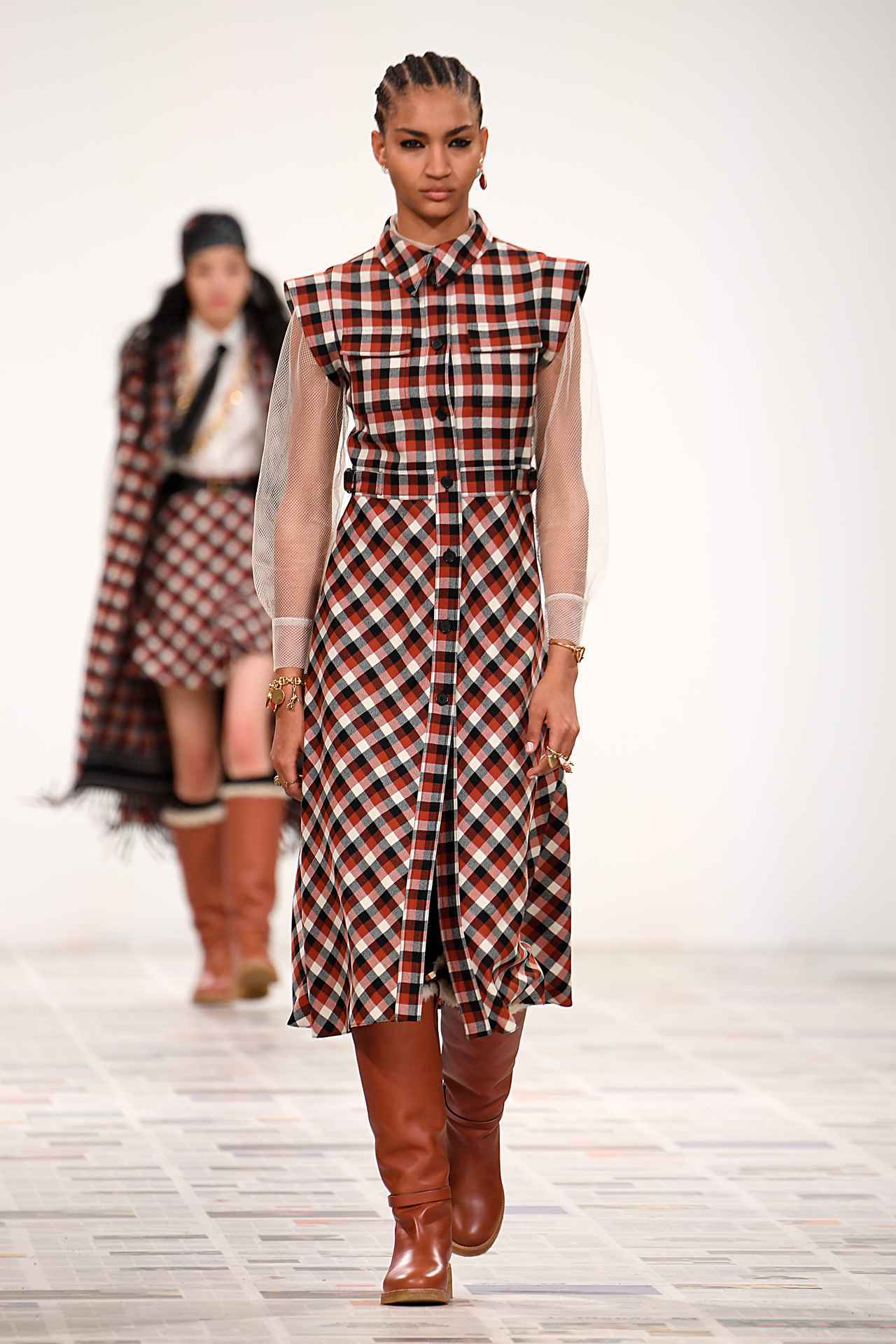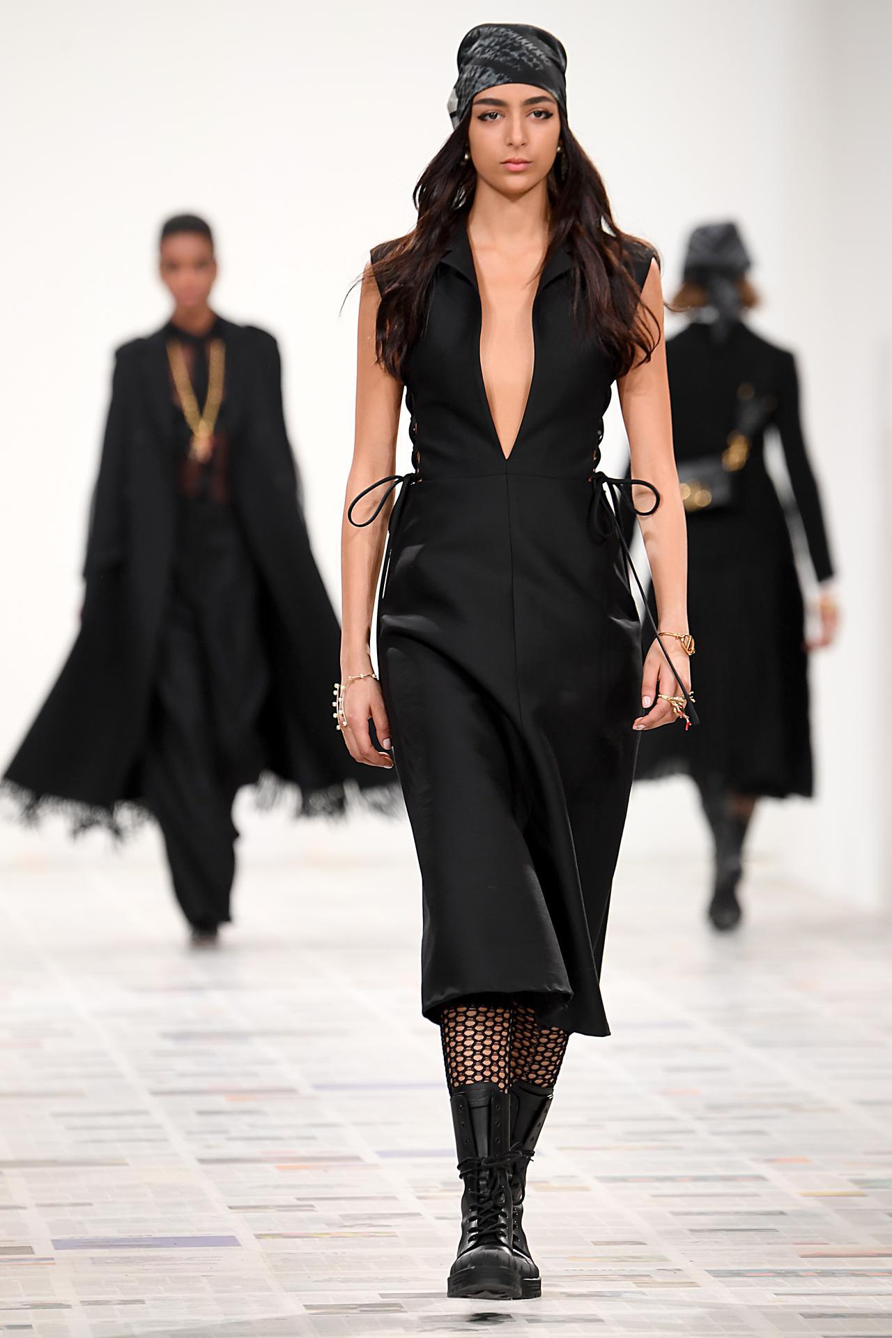 さらにフリンジやバンダナ、ポンチョなど1970年代風のボヘミアンスタイルも登場し、自由な女性を演出。ワンピースにコンバットブーツを合わせるという力強さと女性らしさが共存したスタイリングも登場した。