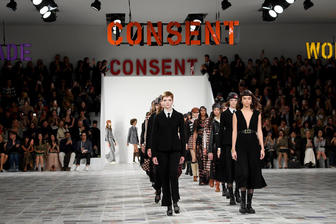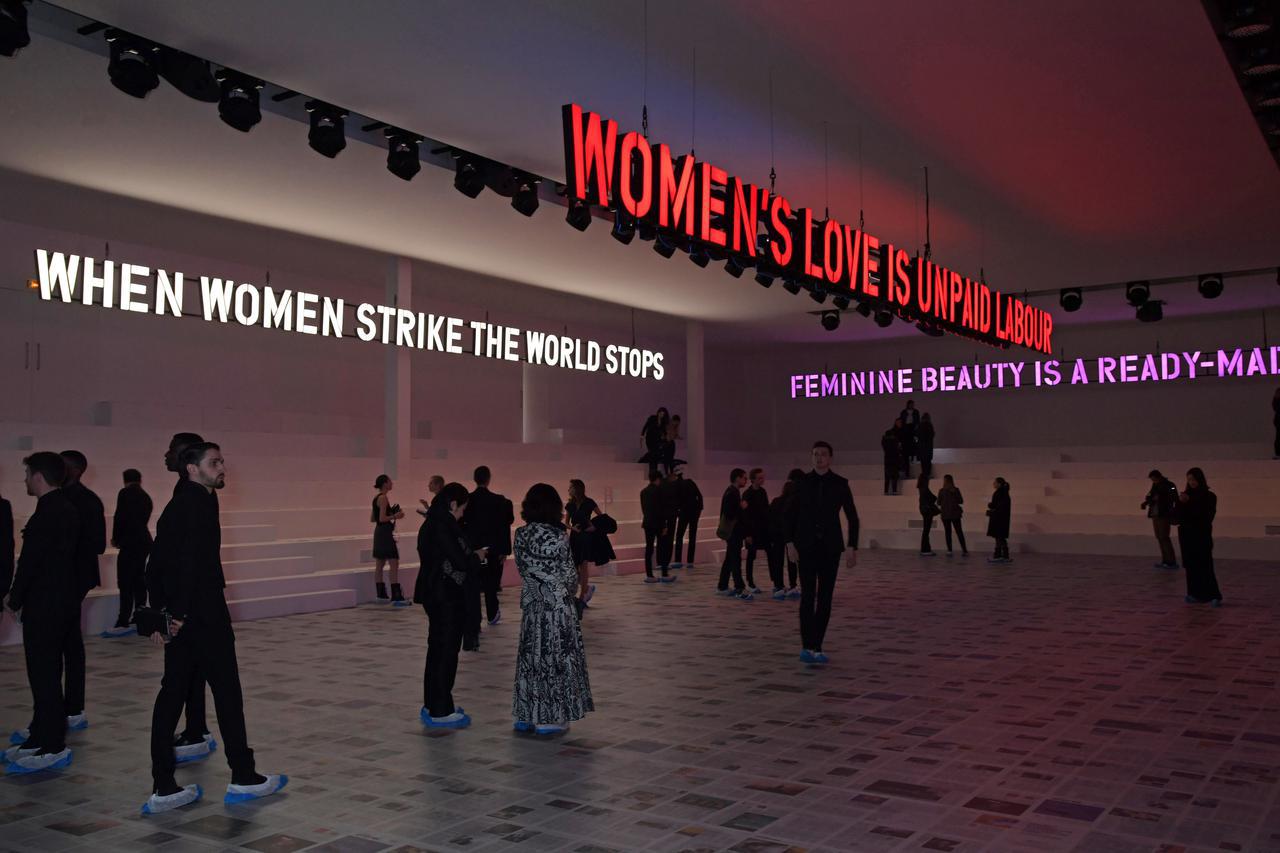 会場の頭上には、「WHEN WOMEN STRIKE THE WORLD STOPS.(女性がストライキすれば世界は止まる)」、「Patriarchy = Oppression(家父長制=抑圧)」、「Women’s love is unpaid labour(=女性の愛は無給労働)」といったイタリアの批評家でフェミニストのカルラ・ロンツィのマニフェストが掲げられており、床は新聞Le Mondeのページで埋め尽くされ、デザイナー就任当時からフェミニストとして女性をサポートし続けてきたデザイナーを務めるマリア・グラツィア・キウリのぶれない心意気が反映されていた。