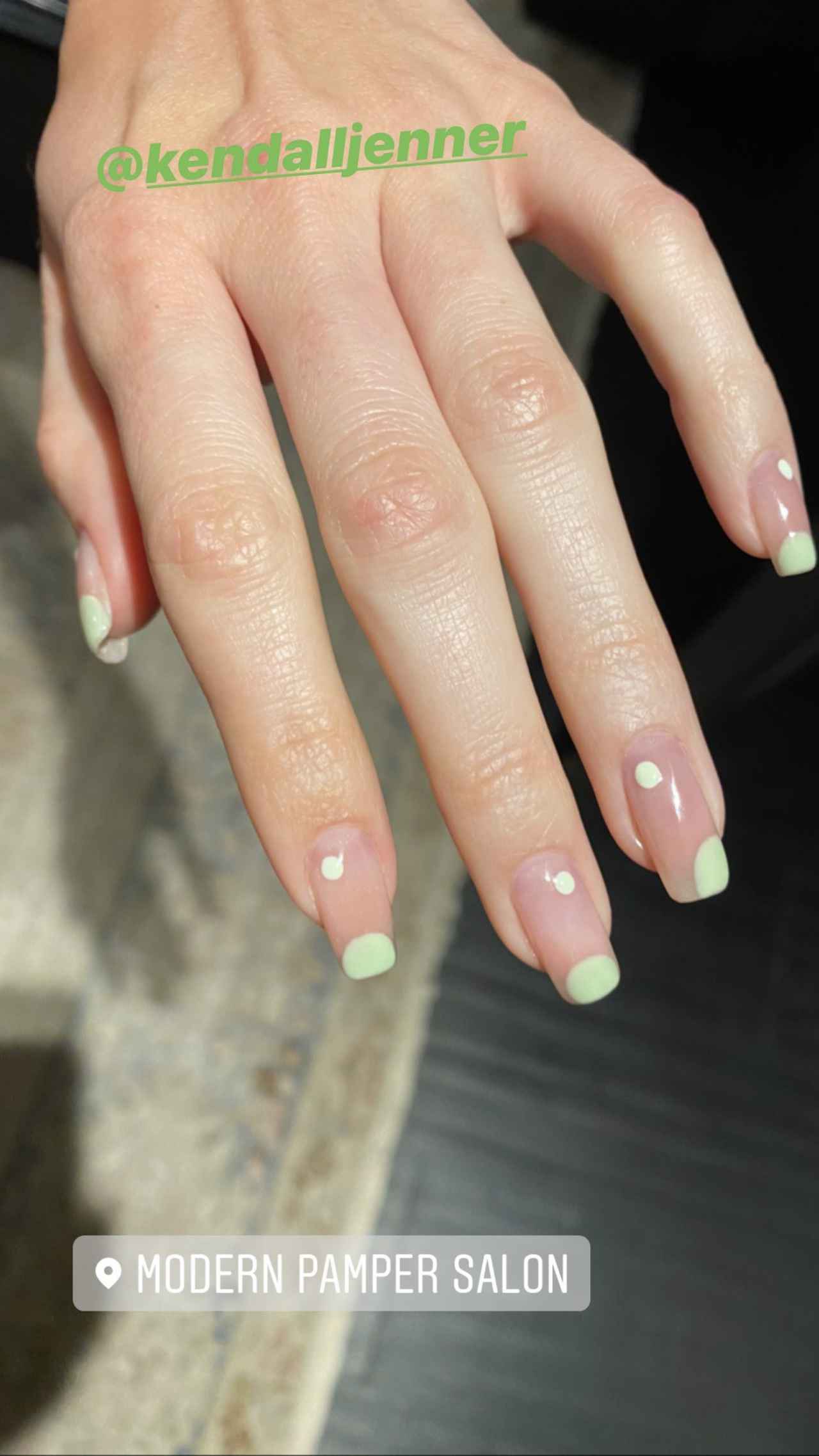 モデルのケンダル・ジェンナーは、トレンドのネガティブスペースネイルで春色を満喫。淡いパステルグリーンのネイルカラーで不規則なマーブル模様を描き、あえてスペースを残すことで抜け感あるネイルに仕上げている。