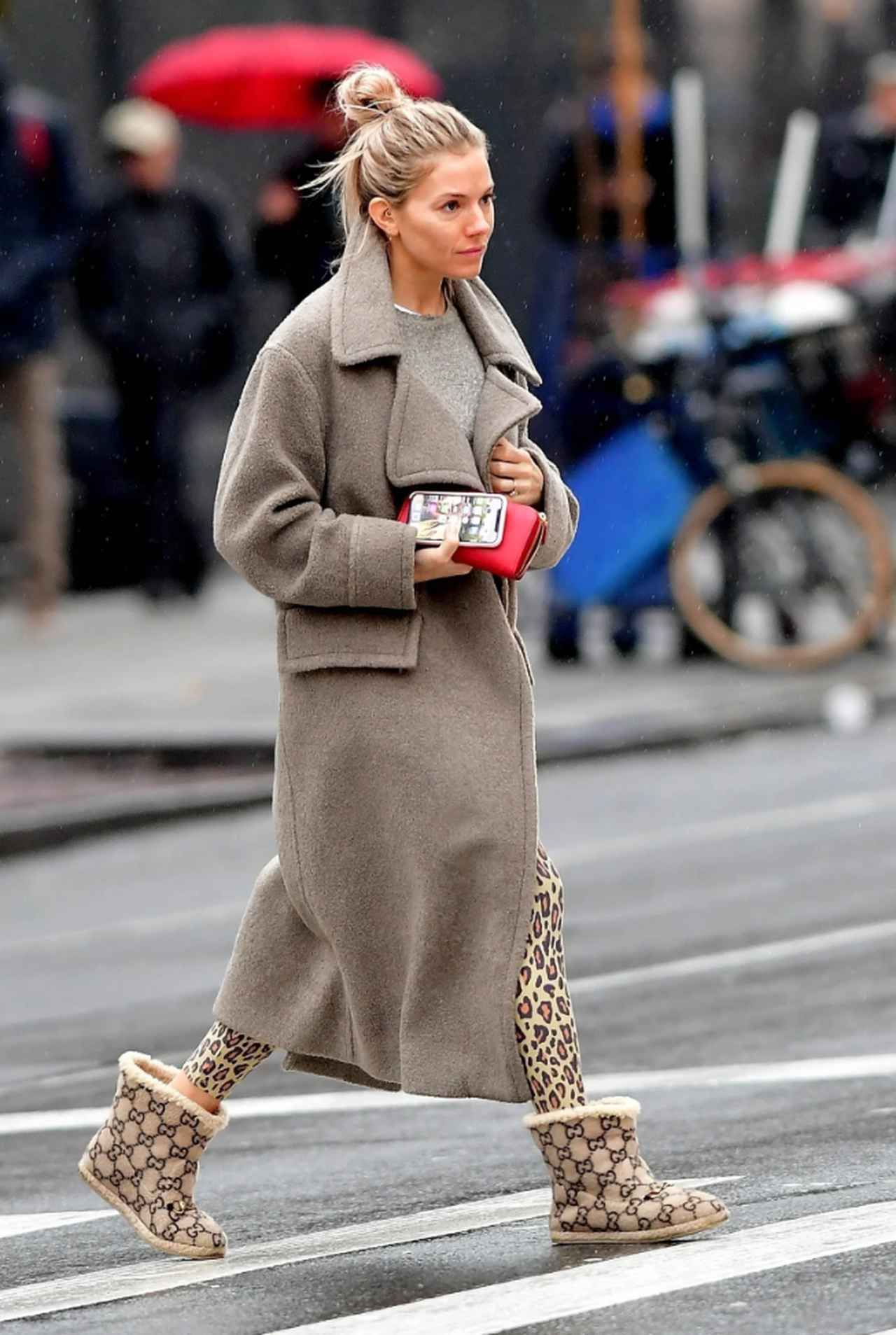 女優でファッションにも定評があるシエナ・ミラーは、ベージュのロングコートとレオパードプリントのレギンスに、グッチの「GGウールシューズ」を合わせたヒップなコーデを披露。