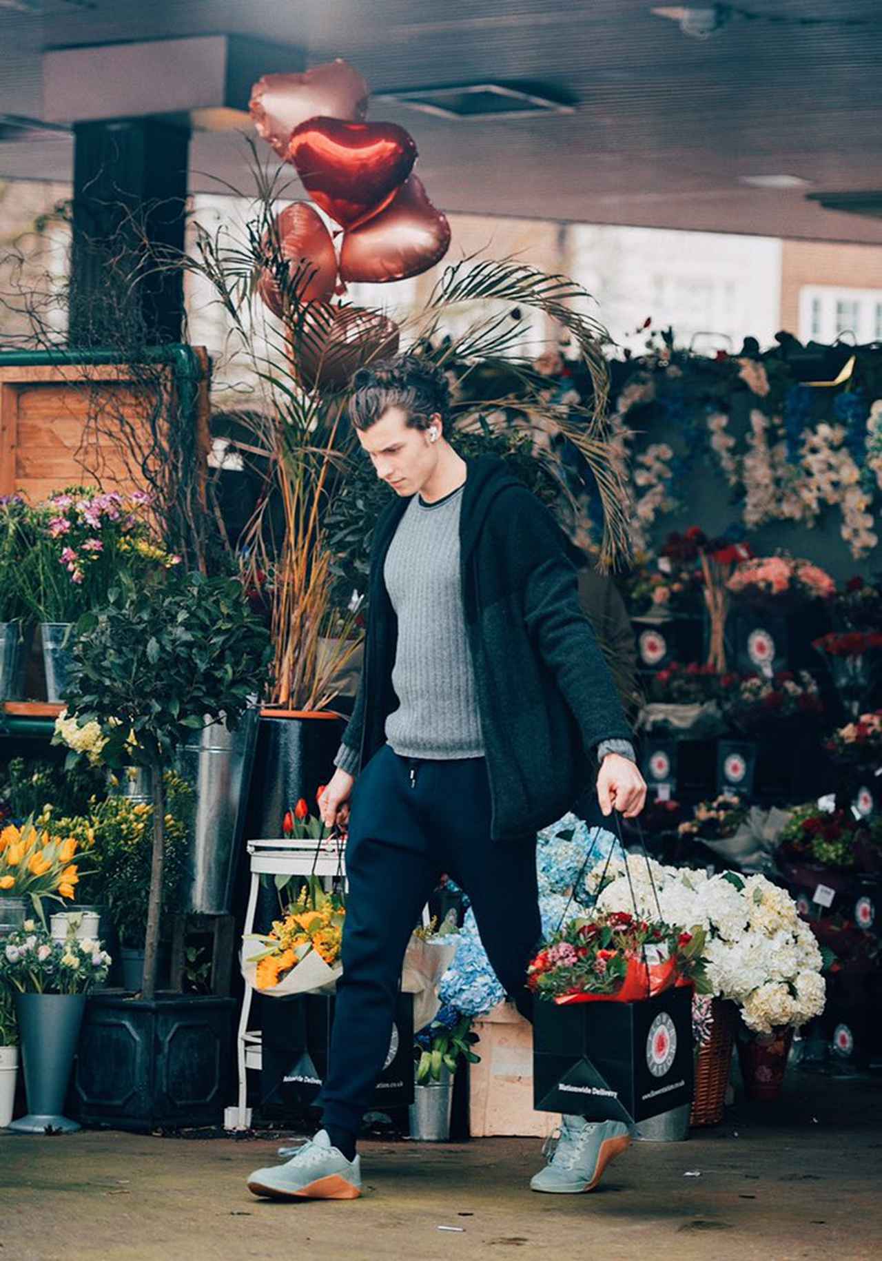花束が入った紙袋を両手に持って花屋から出てくるショーン。