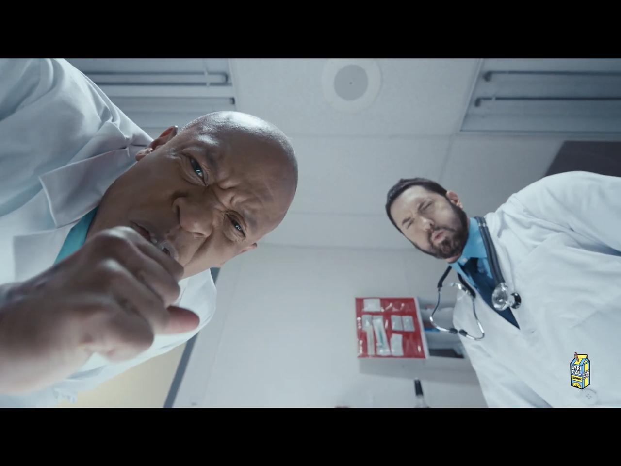 続いてシーンは変わり、今度は病院に。エミネムが横たわる手術室には、医者を演じるもう1人のエミネムと、エミネムの長年のコラボレーターで大御所ラッパーのドクター・ドレも登場。2人目の友情出演となったドクター・ドレの後ろから再びマイクが登場し、「アイム・ソーリー」と言いながら絆創膏を貼ってあげようとするカオスな空間が展開される。結局、エミネムは医師のエミネムによって刺殺されてストーリーは終了する。