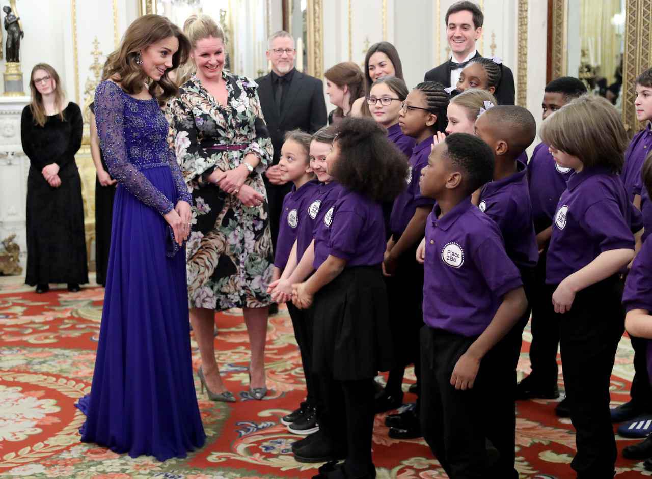 3月9日に、キャサリン妃がパトロンを務める、若者のメンタルヘルスをサポートするチャリティ団体Place2Beの25周年を記念して、バッキンガム宮殿で開かれた祝賀会。パーティーの初めには、ロンドンの小学校に通う生徒たちが、ロイヤル・フィルハーモニー管弦楽団の音楽家たちの助けを借りて、キャサリン妃のために歌を披露した。この日のために作られた曲を練習してきた小学生たちの姿に、自分も6歳のジョージ王子と4歳のシャーロット王女を育てるキャサリン妃は、大感激したよう。