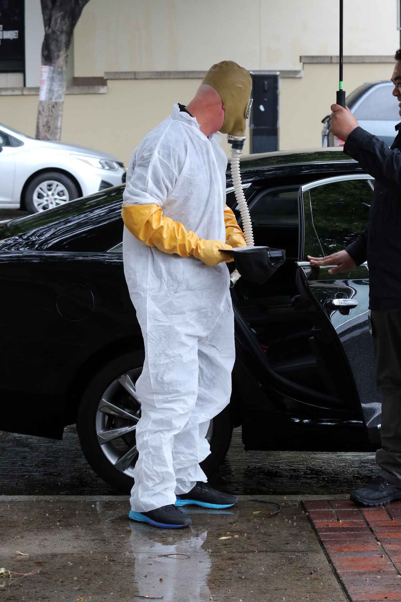 さらにその手から腕には、長いゴム製の手袋も。手袋がオレンジで、スニーカーのソールがライトブルー、しかもガスマスクについているチューブの先には何もなく、だらんと垂れ下がっているだけのため、なんだか新しいおしゃれにすら見えてきてしまうホーウィーの恰好は、本人的にもジョークの意味だったよう。