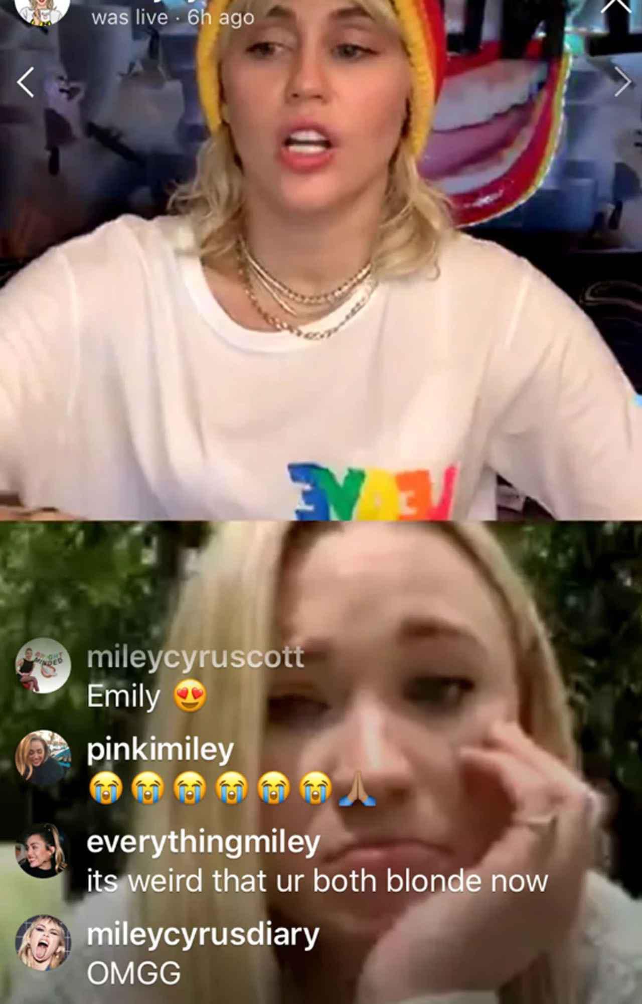 自宅とみられる場所から、インスタグラムのライブ配信に参加したエミリーは、自身の愛犬とマイリーの愛犬をお互いに挨拶させ、まるで旧友とのプライベートな電話を楽しんでいるかのようにリラックスした様子。