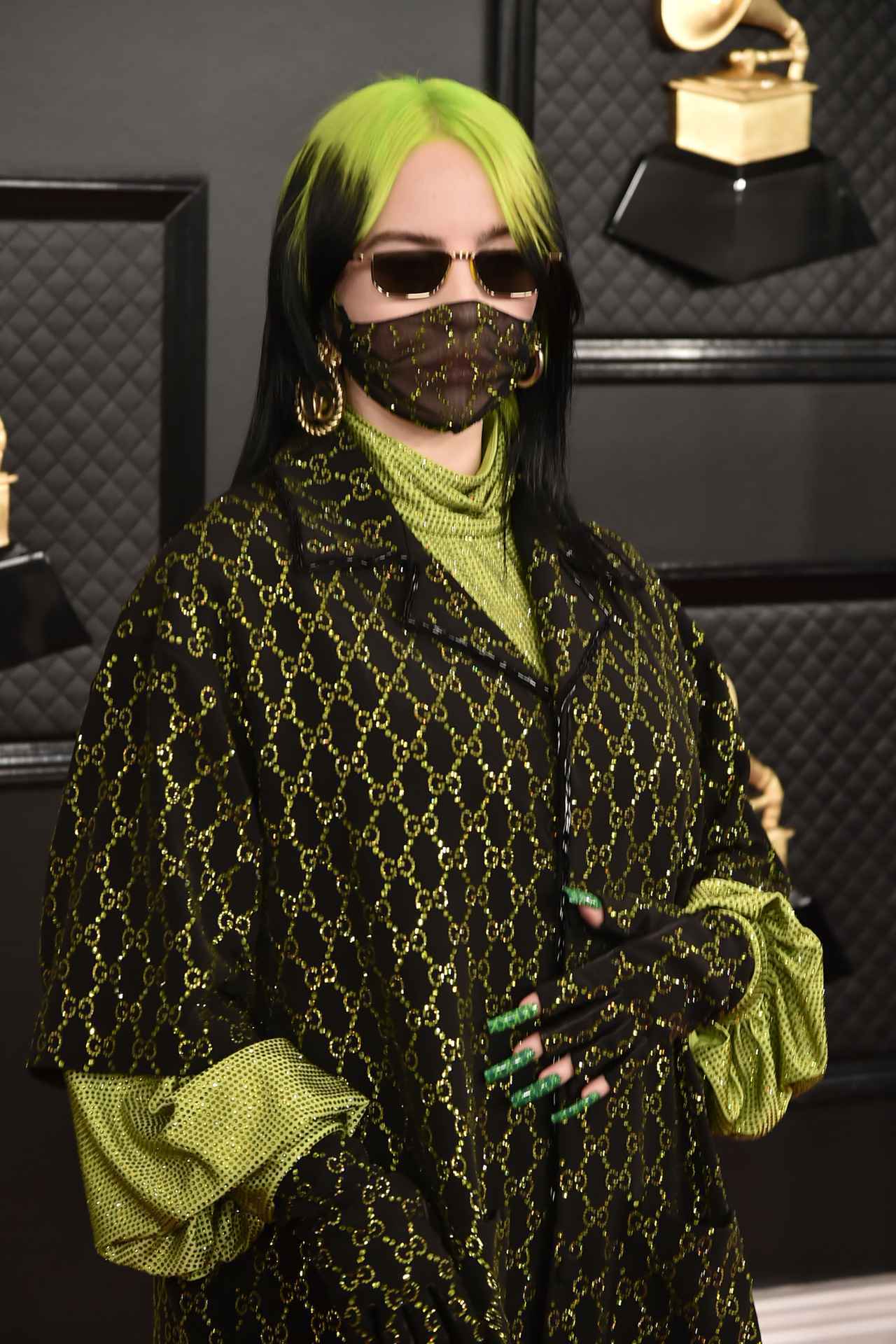 2020年の第62回グラミー賞にて、女性初、最年少で主要4部門を独占、合計5冠に輝いたビリー・アイリッシュは、グラミー賞のレッドカーペットに、全身グッチのカスタムスタイルで登場して話題に。ジャケットに合わせ、マスク、ネイルもグッチのロゴで統一して全身ブラック×グリーンの、モードなマスクファッションを披露。